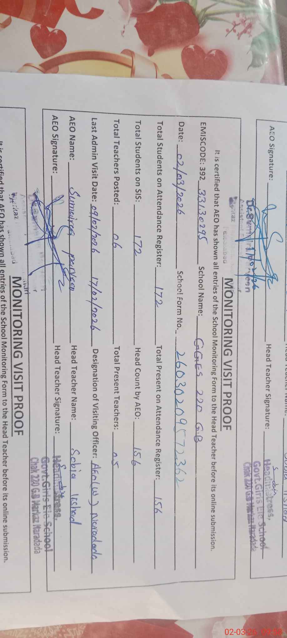 | EMIS Code: 33130295 | Name of School: GGES CHAK NO 220 GB | |||