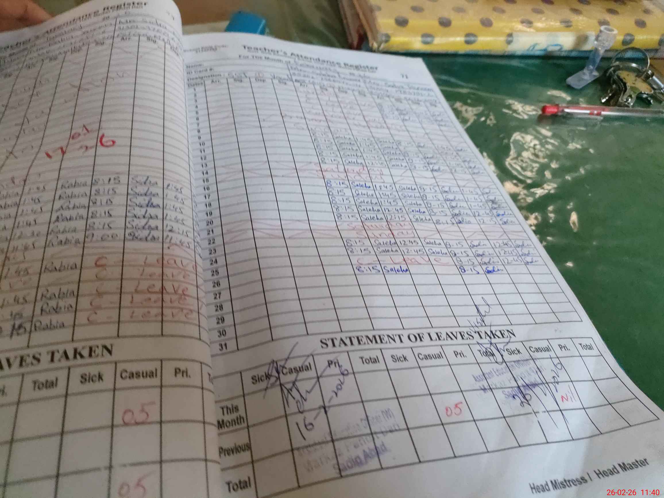 | Leave | Duty | Absent | Maternity | Medical | Ex- Pak |