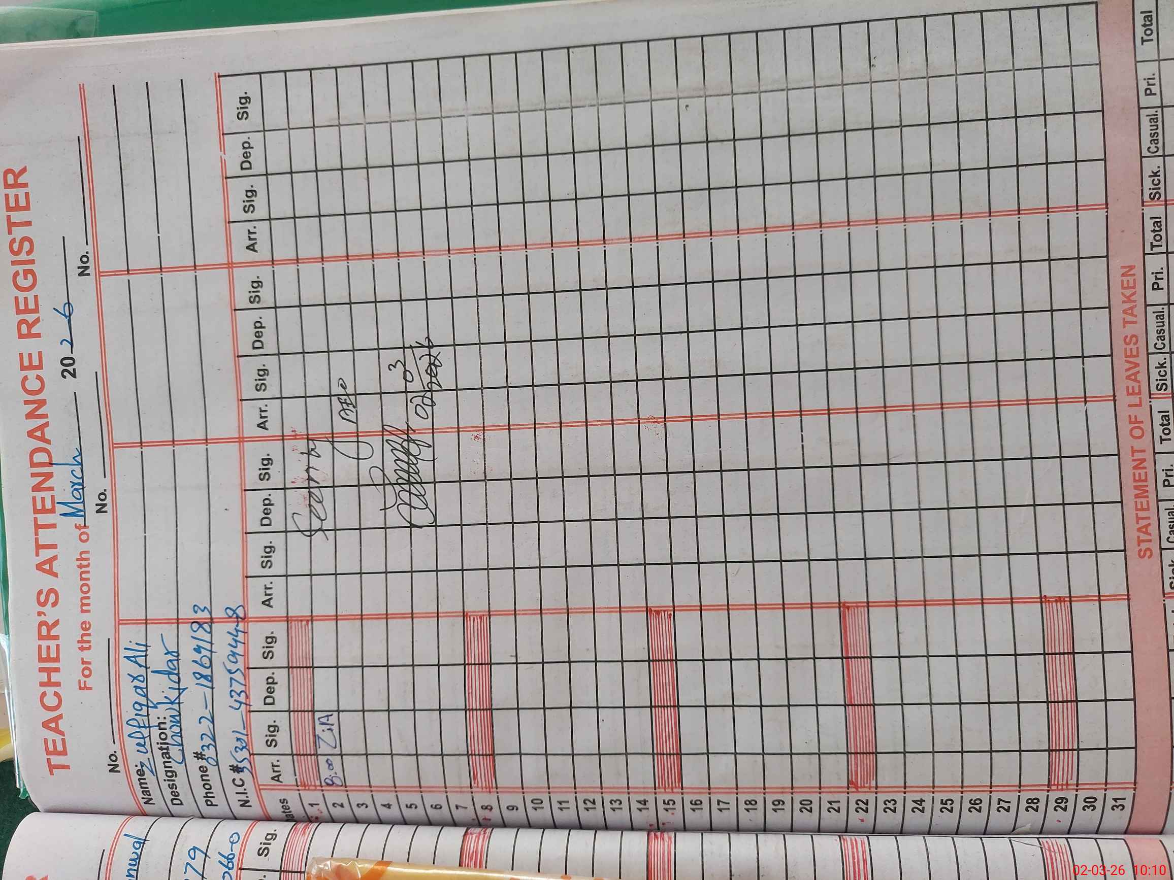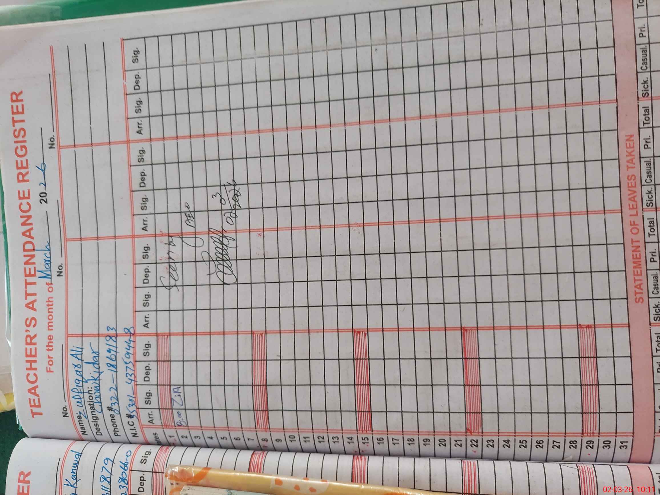 | Name: AZ**** Be**** Designation: (School Headmaster's/Headmistress's) PST Phone/Cell Number: 03**** |