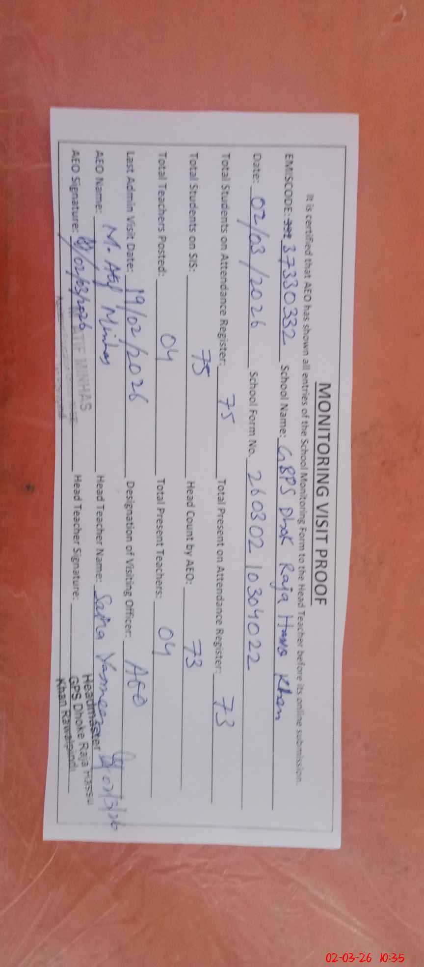 | EMIS Code: 37330332 | Name of School: GPS DHOK RAJA HUSSO KHAN | |||