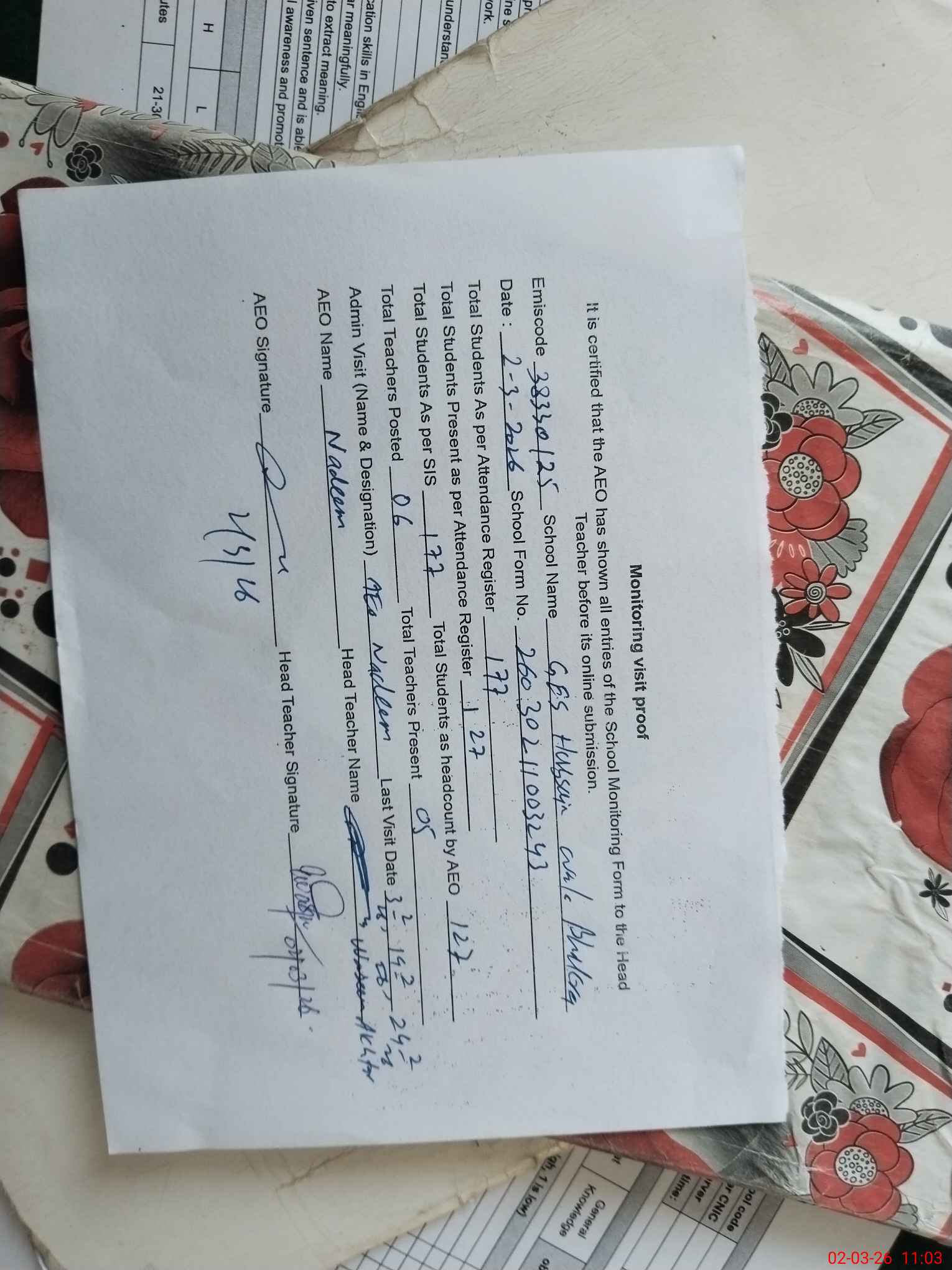 | EMIS Code: 38330125 | Name of School: GES HUSSAIN WALA BHAKRA | |||