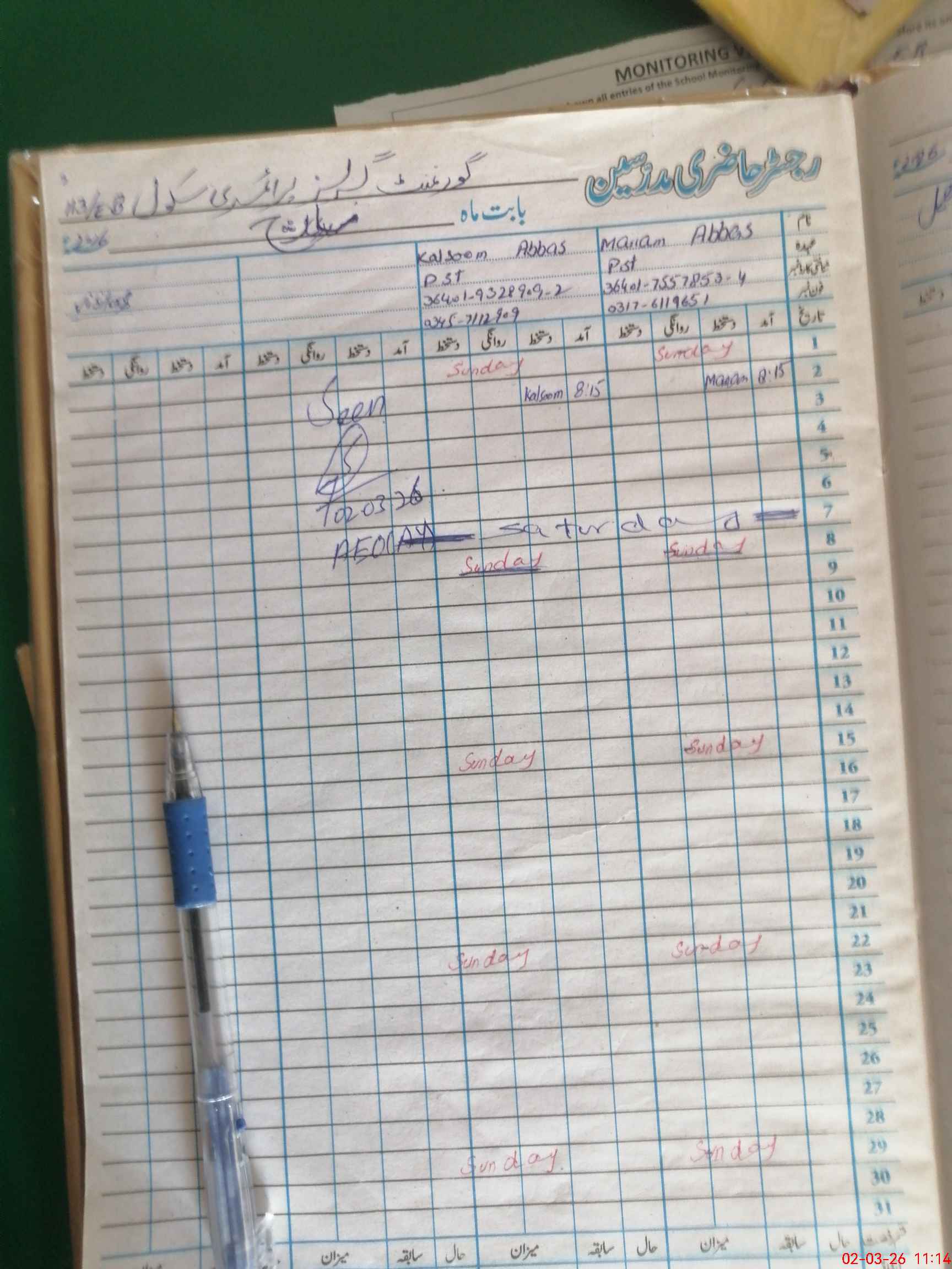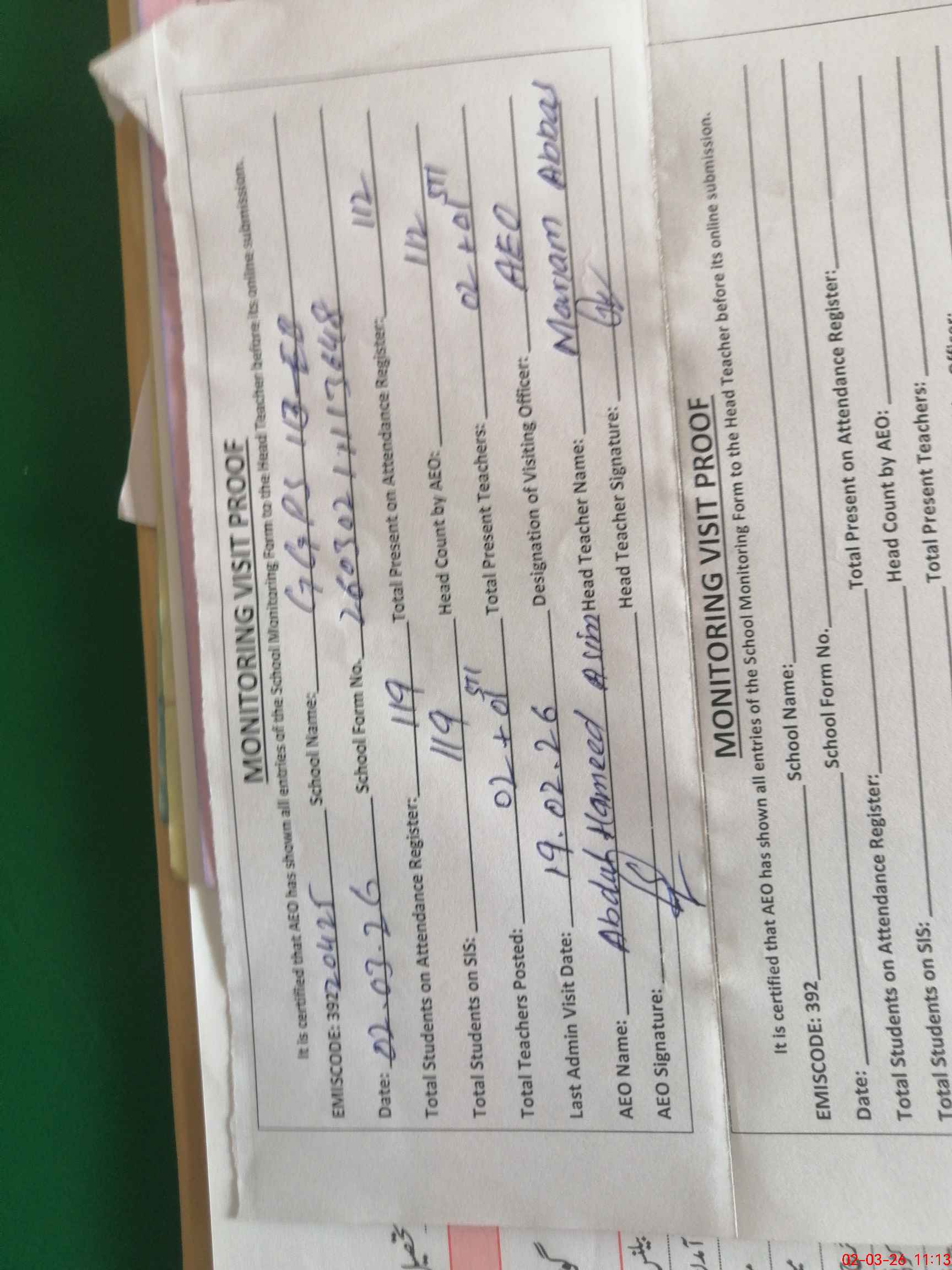 | Attendance Register | Head Teacher | MEA with School | Visit Proof |