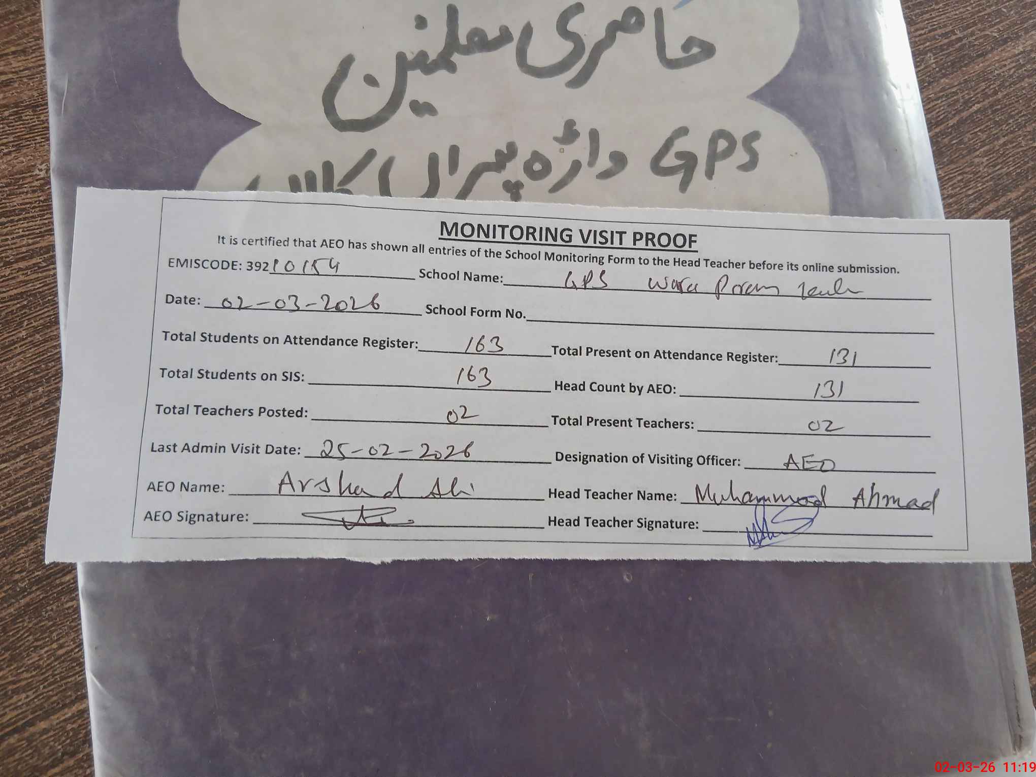 | EMIS Code: 39210154 | Name of School: GPS WARRA PIRAN KALAN | |||
