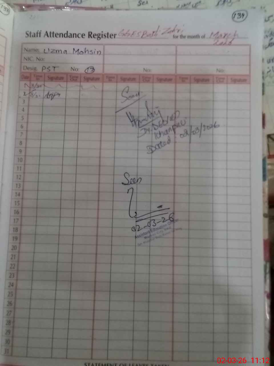 | CNIC | Full Name | Designation | R/C | Absence During Last Calender Month |