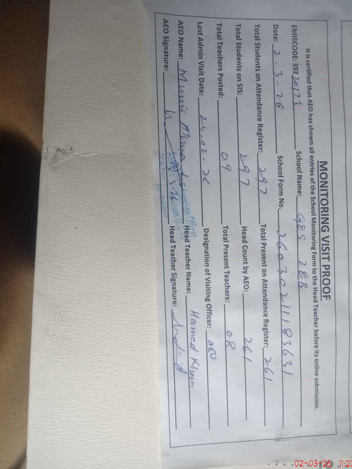 | Attendance Register | Head Teacher | MEA with School | Visit Proof |