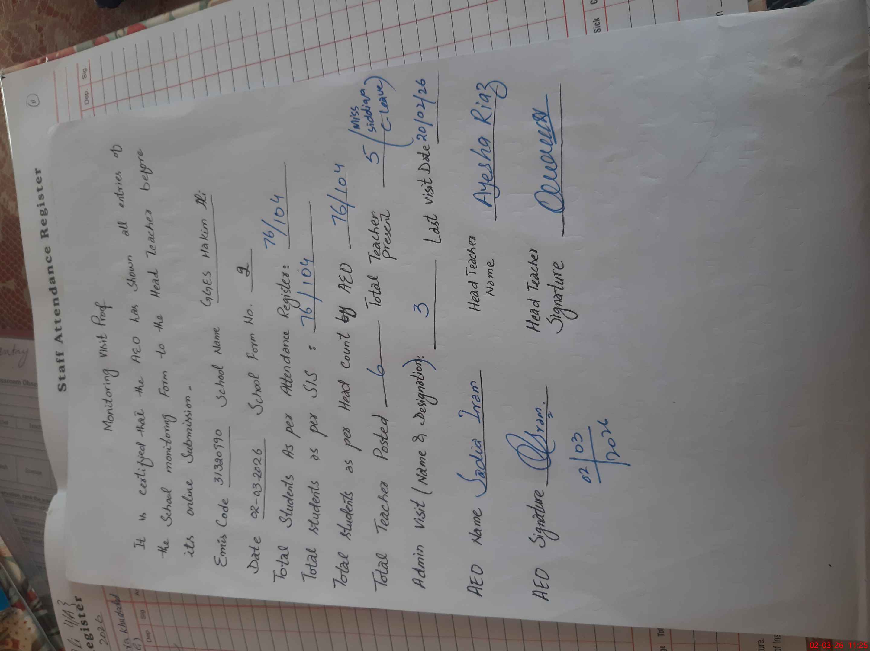 | Attendance Register | Head Teacher | MEA with School | Visit Proof |