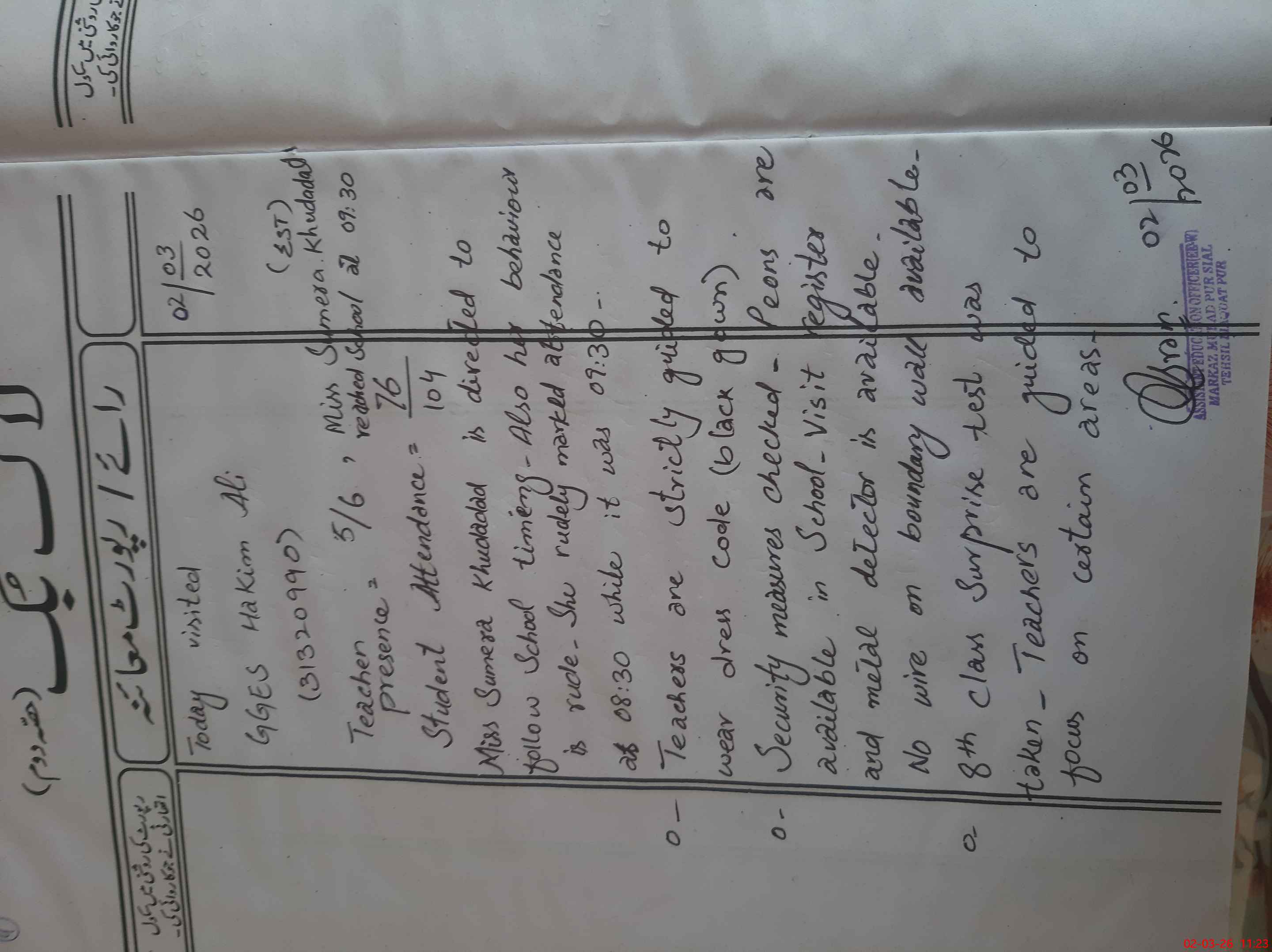 | Certified that this School was Inspected by the Undersigned MEA/DMO Today and the Information Stated Above is as Per Record. | |||||