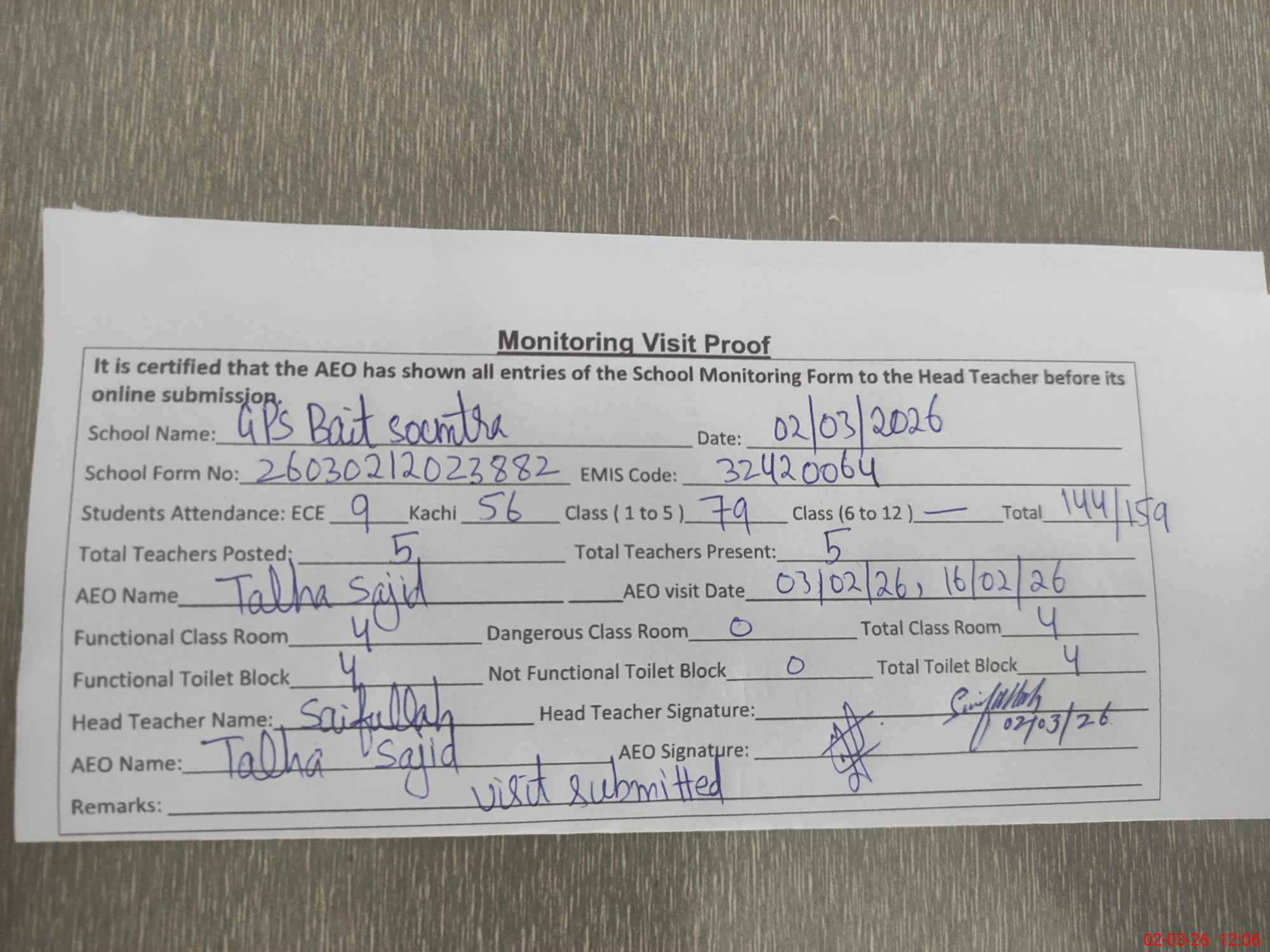 | EMIS Code: 32420064 | Name of School: GPS BAIT SOUNTRA | |||