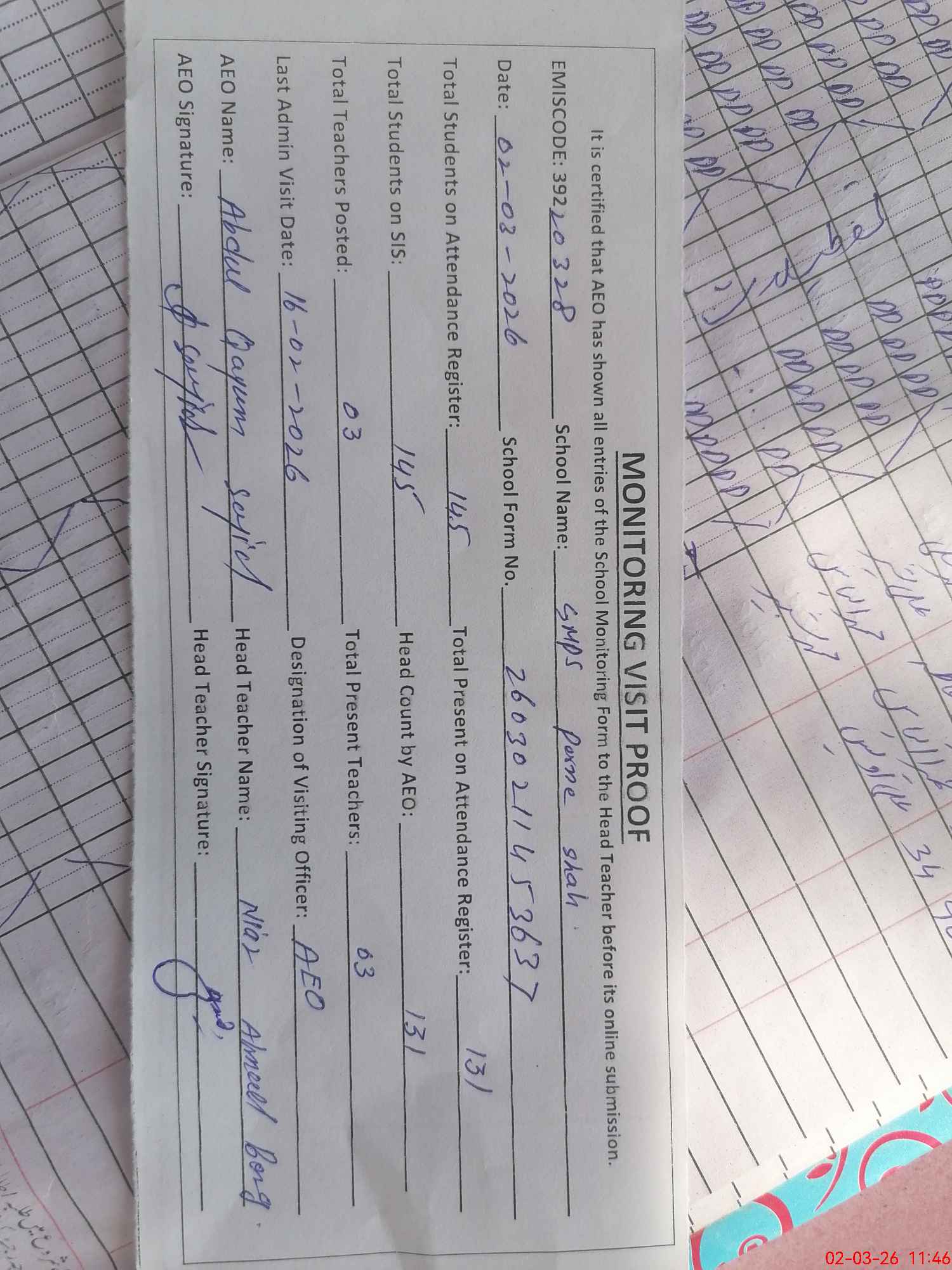 | EMIS Code: 39220328 | Name of School: GMPS PARNAY SHAH PO NOORA RATH ARIF WALA | |||