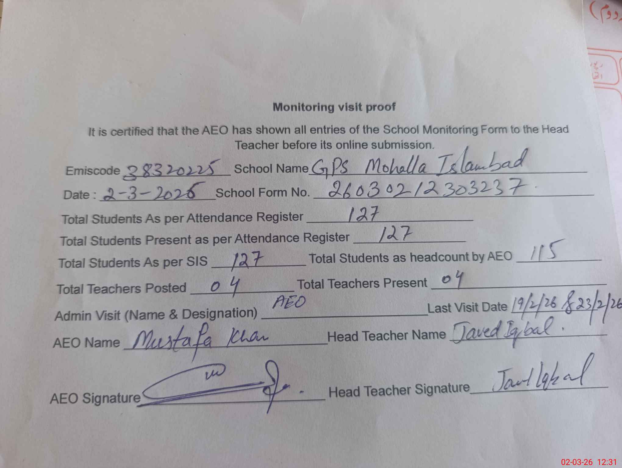 | EMIS Code: 38320225 | Name of School: GPS MOH. ISLAM ABAD | |||