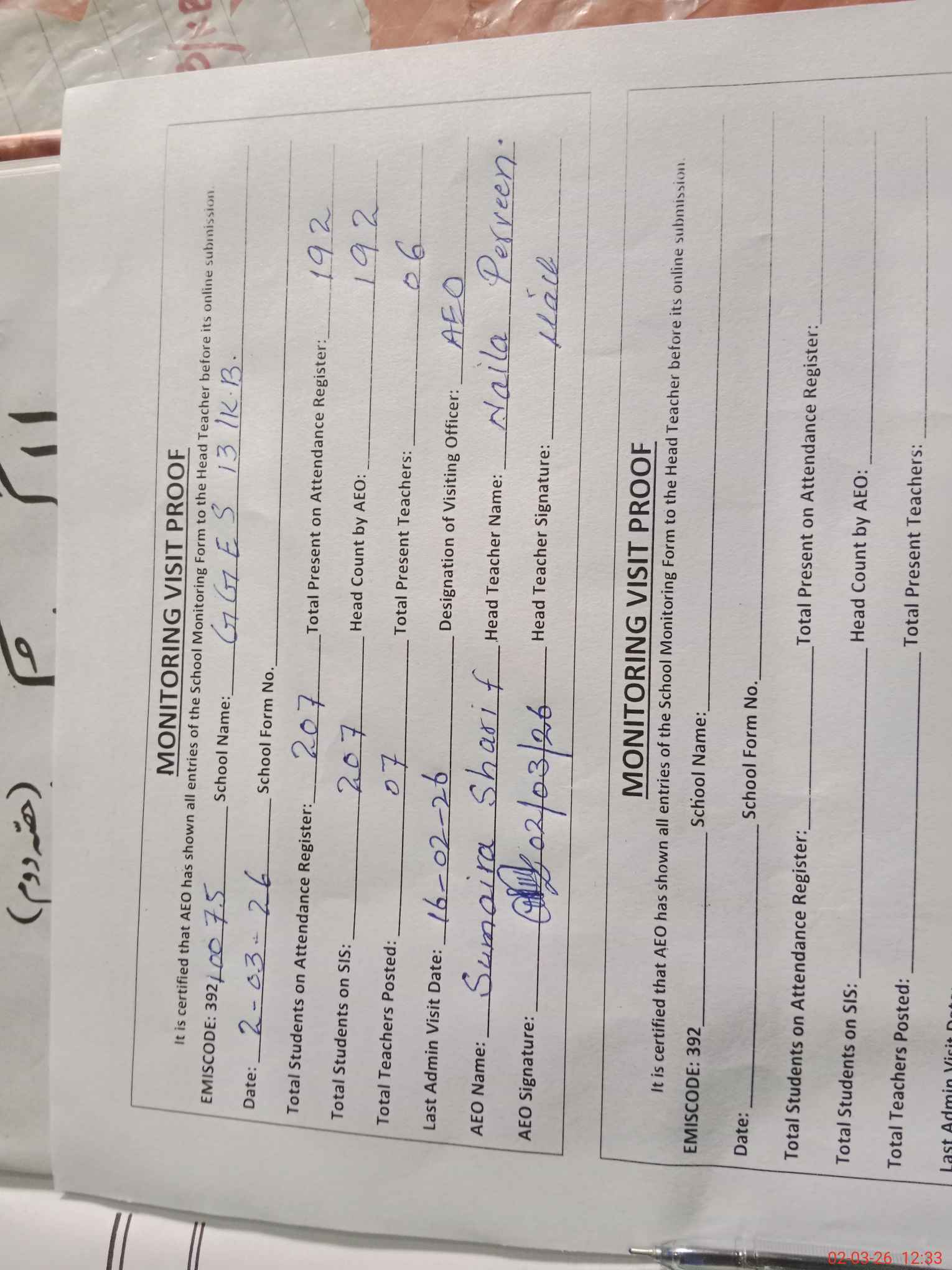 | Attendance Register | Head Teacher | MEA with School | Visit Proof |