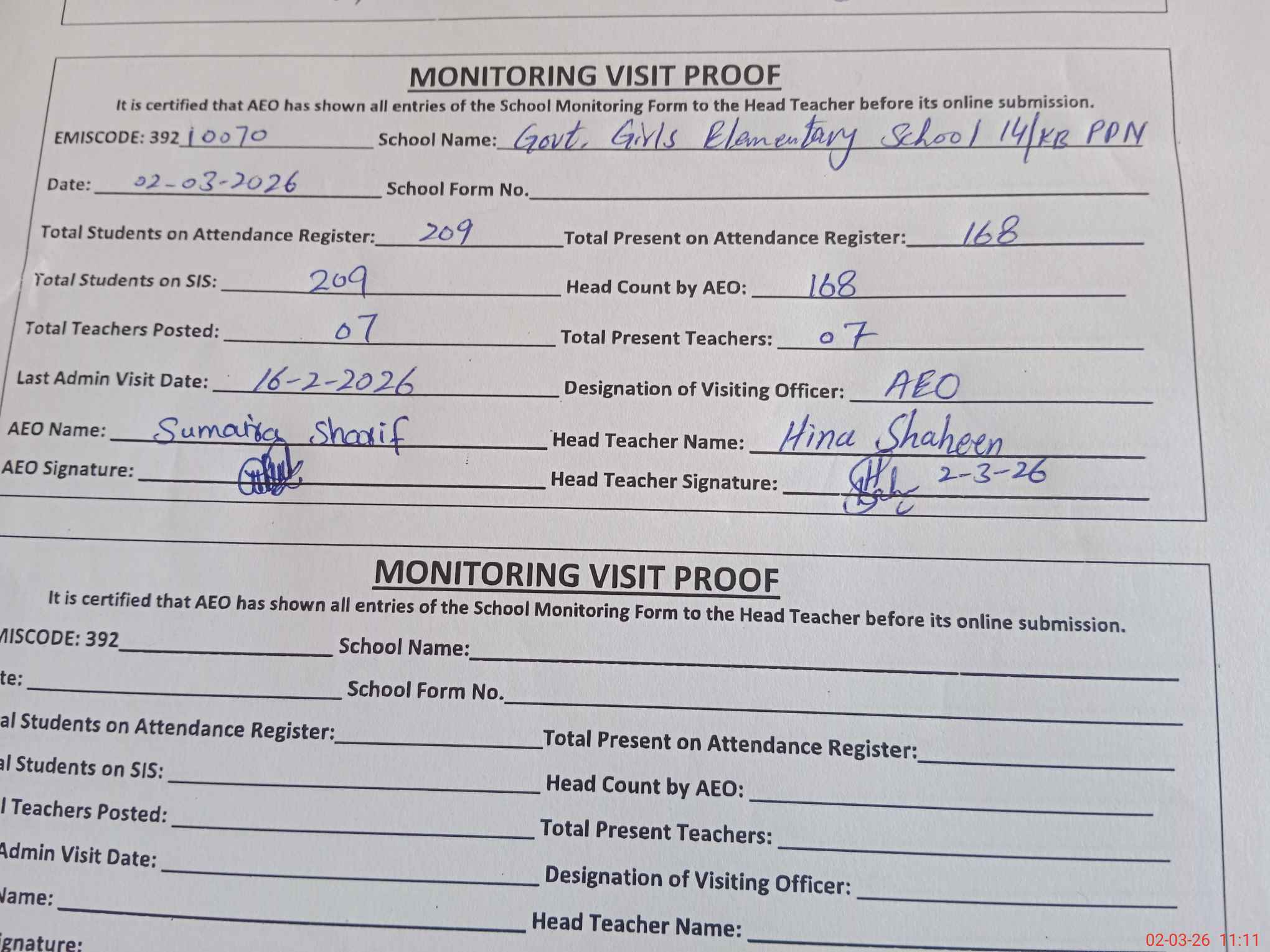 | Certified that this School was Inspected by the Undersigned MEA/DMO Today and the Information Stated Above is as Per Record. | |||||