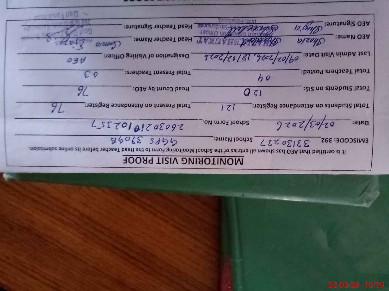 | Certified that this School was Inspected by the Undersigned MEA/DMO Today and the Information Stated Above is as Per Record. | |||||