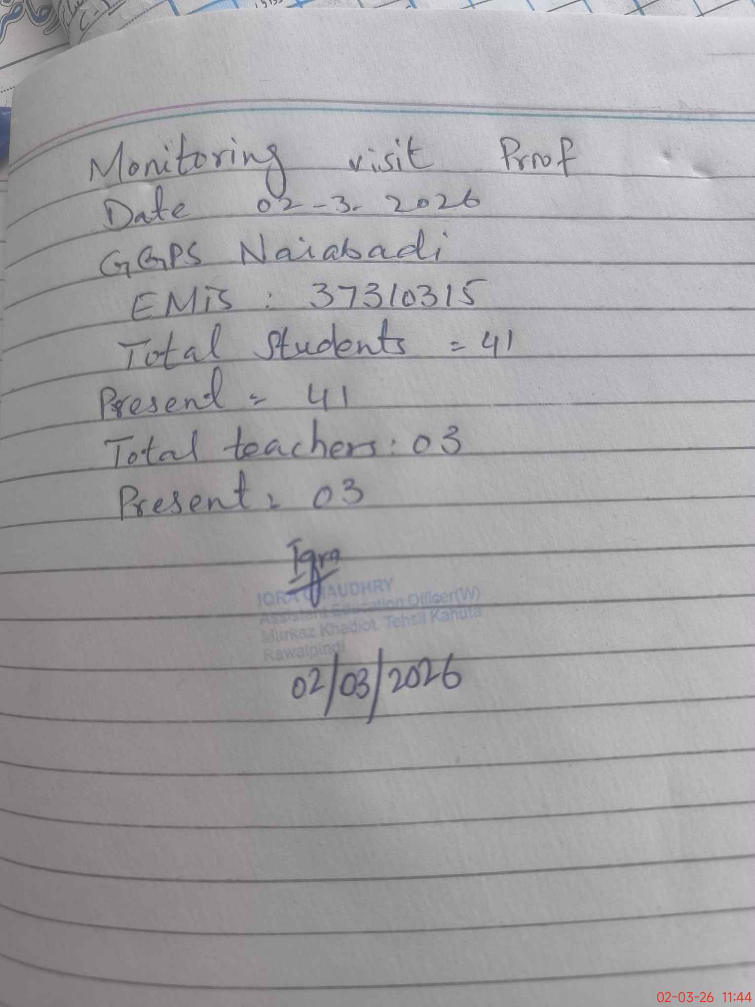 | Attendance Register | Head Teacher | MEA with School | Visit Proof |
