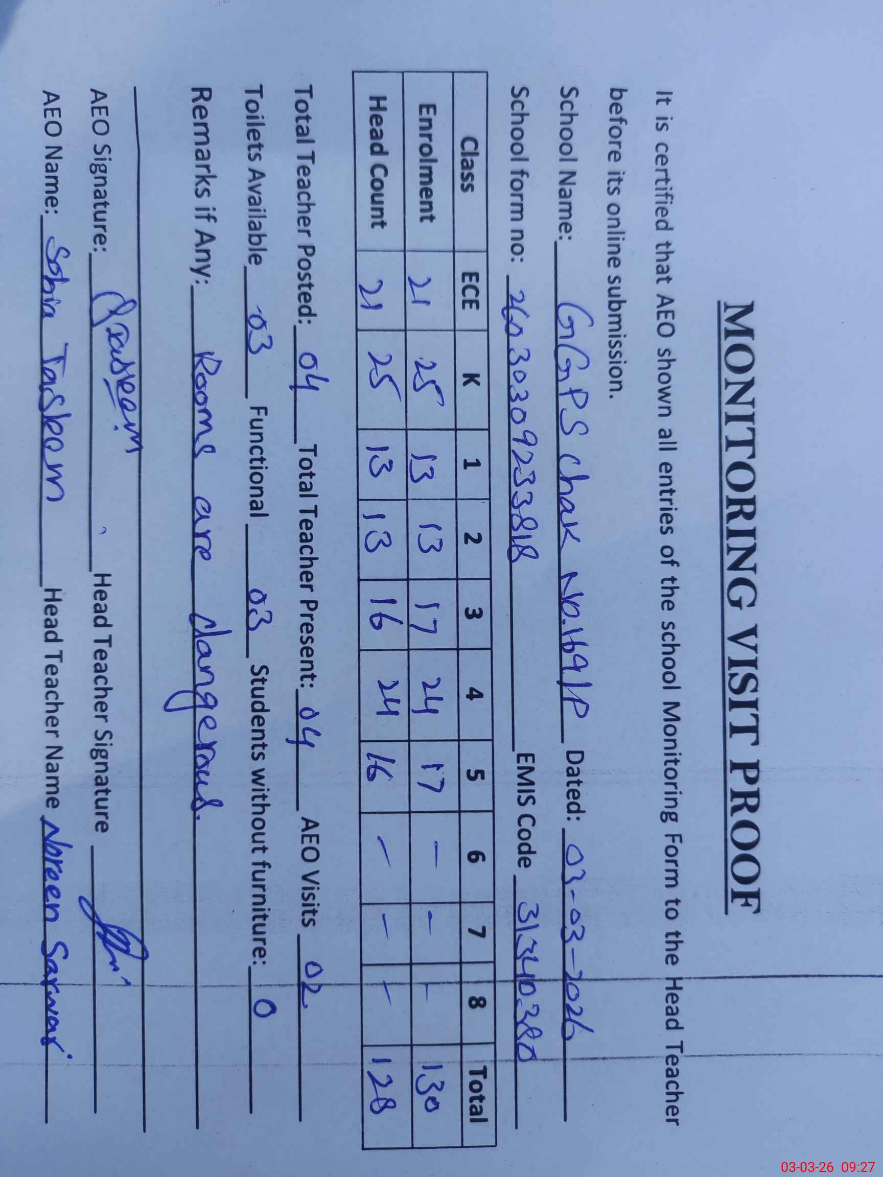 | Attendance Register | Head Teacher | MEA with School | Visit Proof |