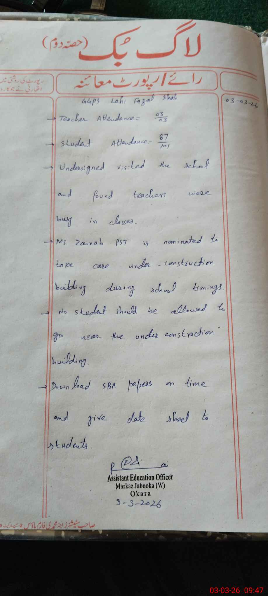 | District: OKARA | Tehsil: OKARA | Markaz: JABOOKA - FEMALE | Level: Primary | |