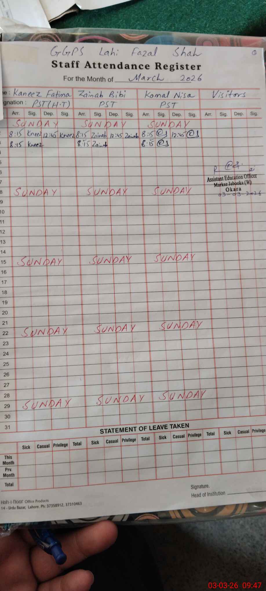 | Name: Ka**** Fa**** Designation: (School Headmaster's/Headmistress's) PST Phone/Cell Number: 03**** |
