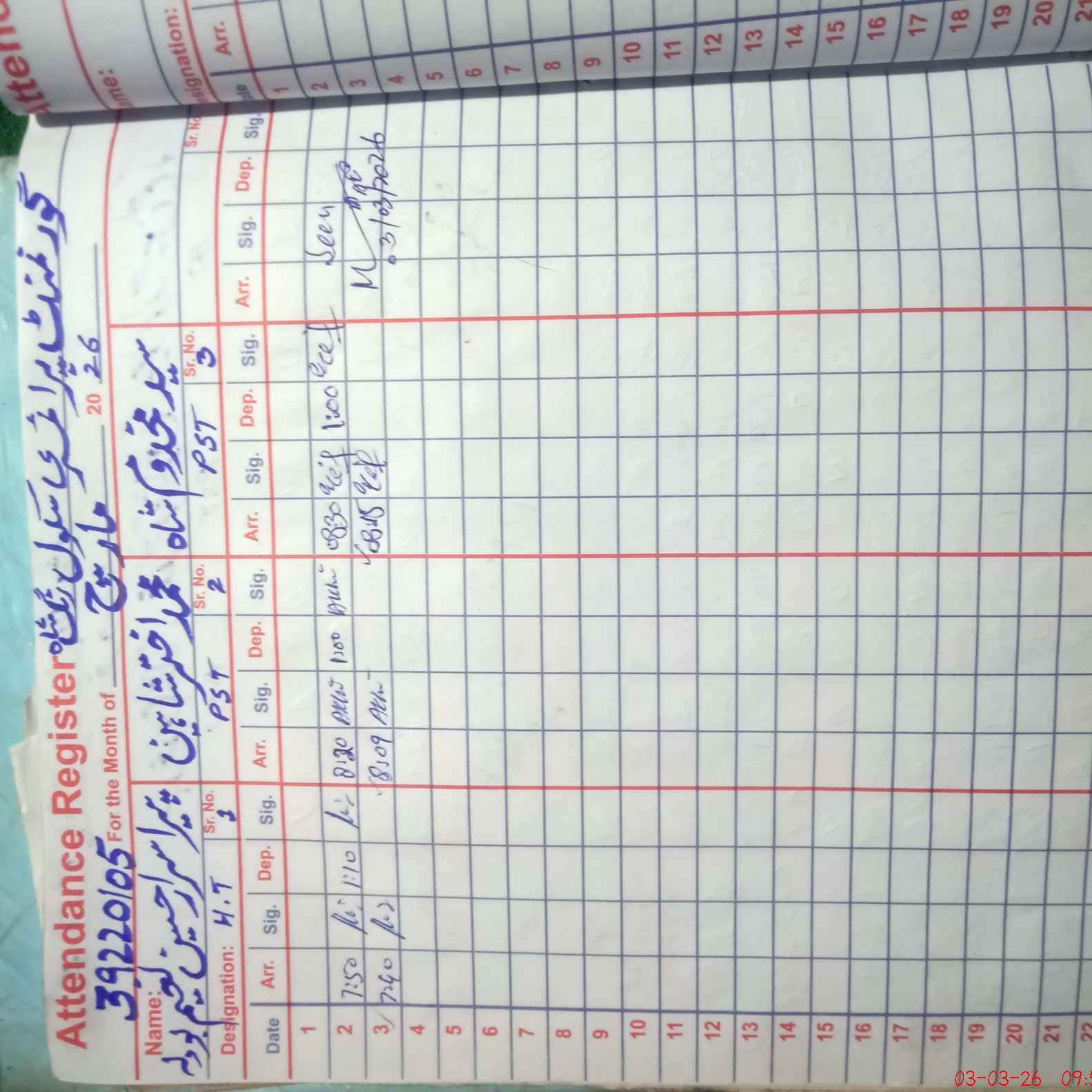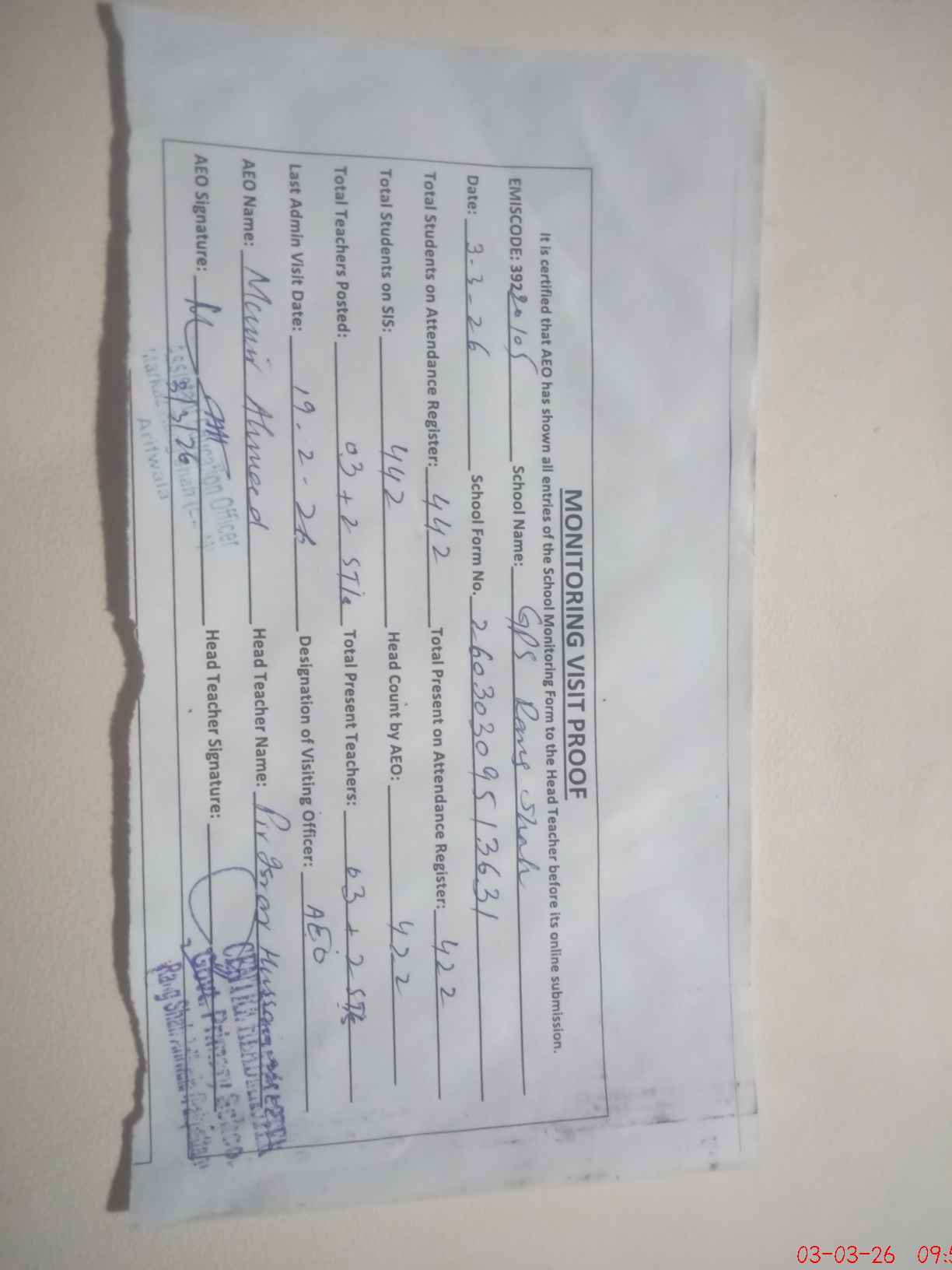 | Monitoring Date: 03-03-2026 | Start Time: 03-03-2026 09:08 AM | End Time: 03-03-2026 09:56 AM | Name of MEA: Mu**** Ah**** | |
