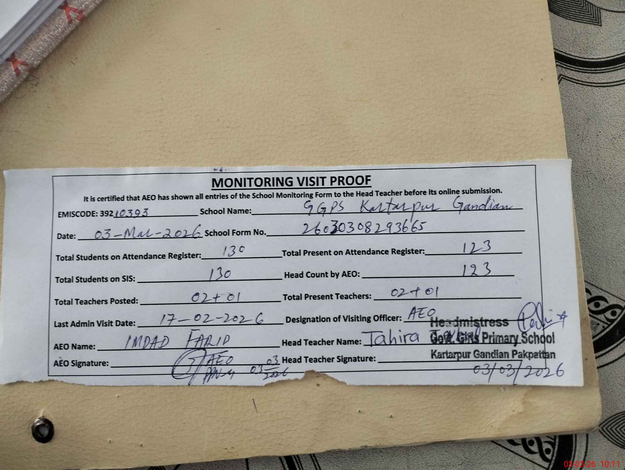 | Attendance Register | Head Teacher | MEA with School | Visit Proof |