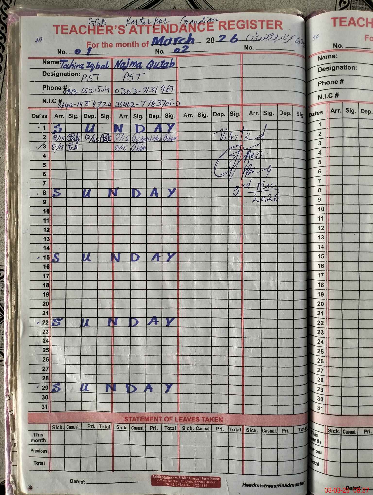 | Name: Ta**** Iq**** Designation: (School Headmaster's/Headmistress's) PST Phone/Cell Number: 03**** |