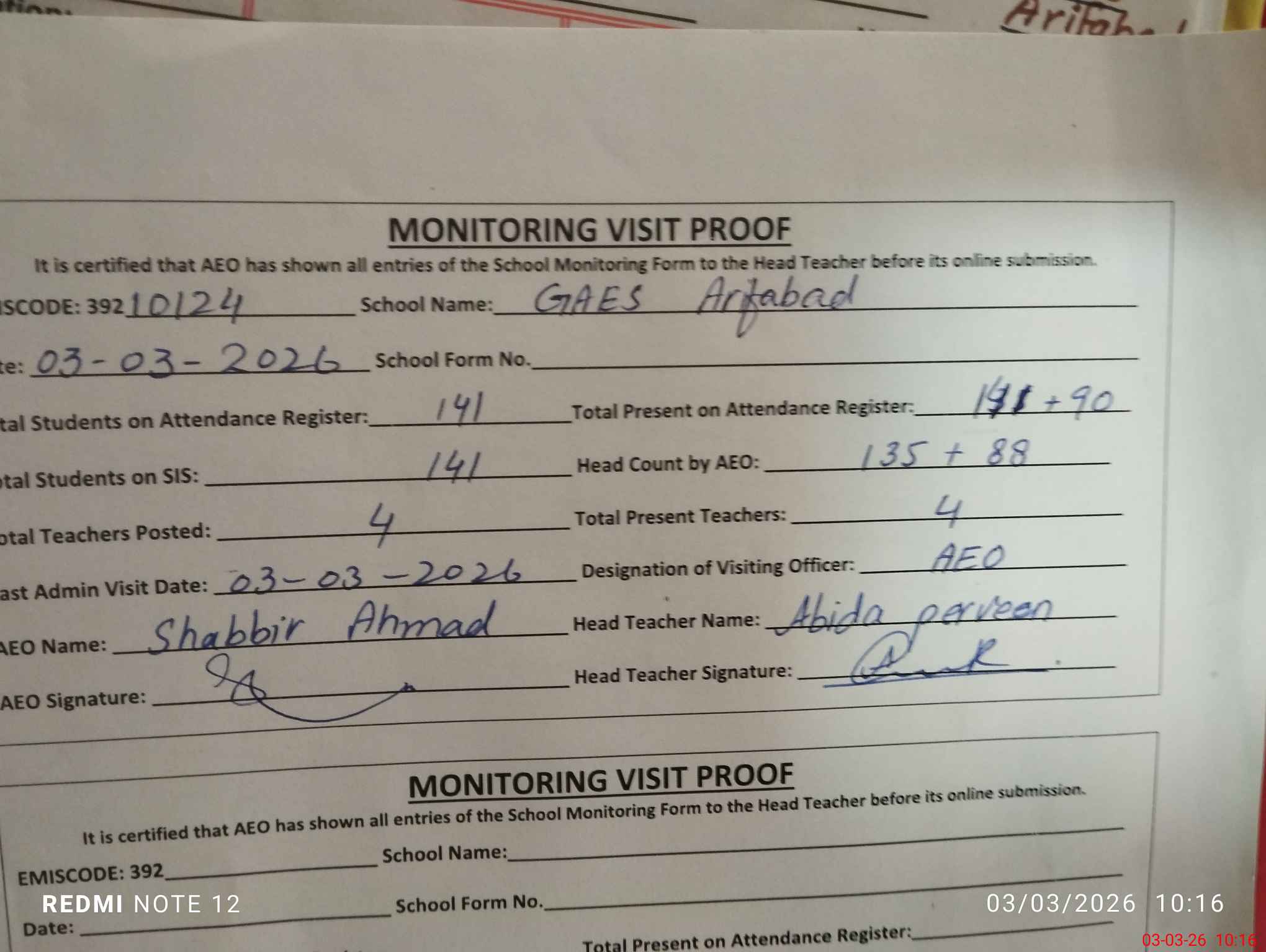 | Attendance Register | Head Teacher | MEA with School | Visit Proof |