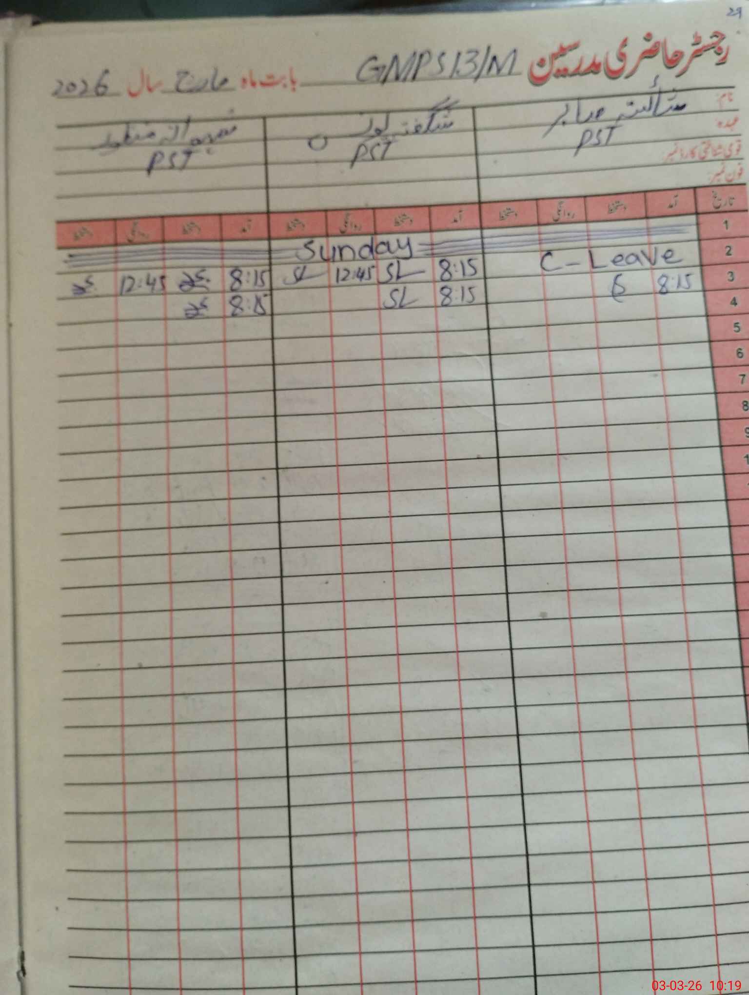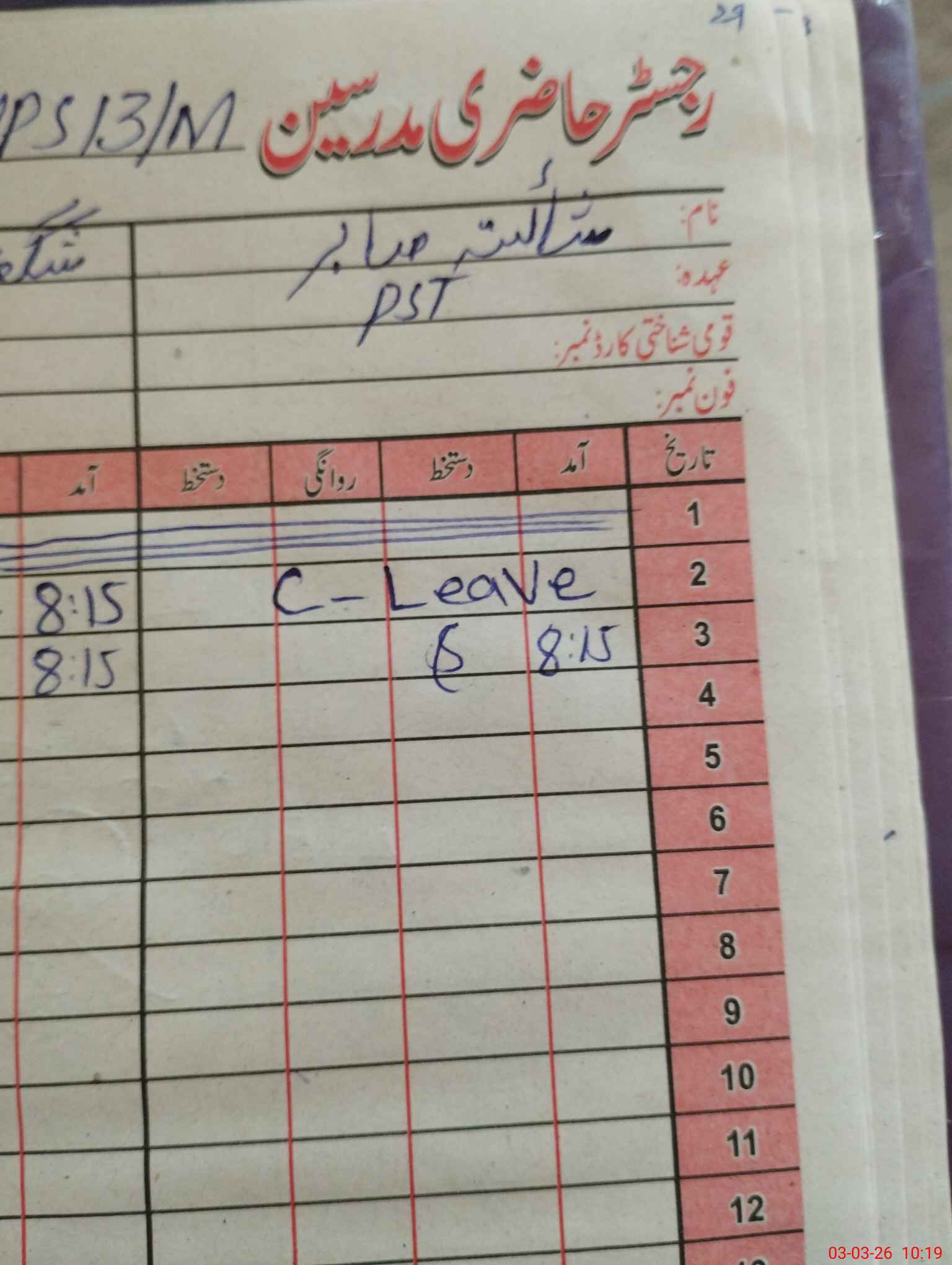 | CNIC | Full Name | Designation | R/C | Absence During Last Calender Month |
