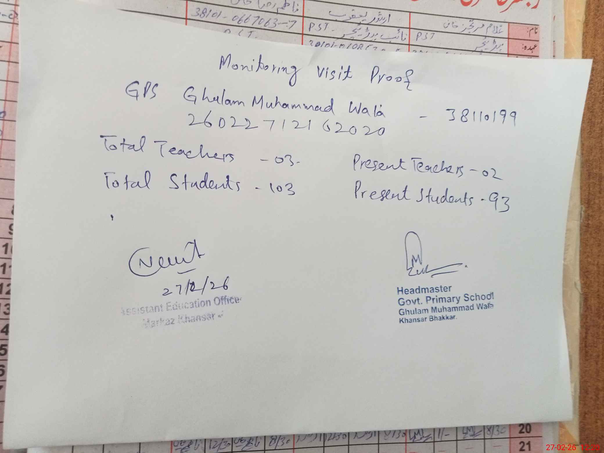 | EMIS Code: 38110199 | Name of School: GPS GHULAM MUHAMMAD WALA PO KHANSAR | |||