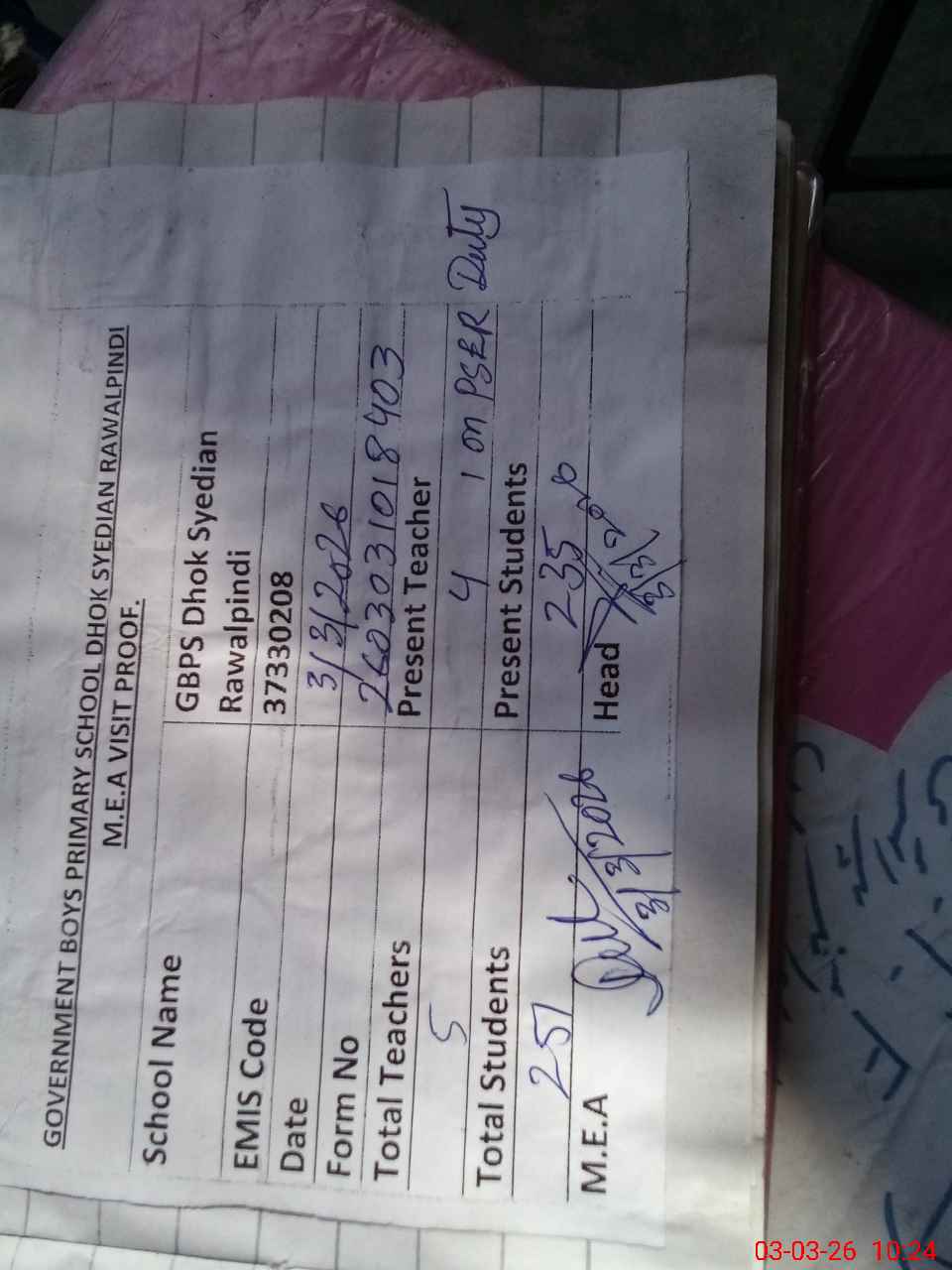 | Certified that this School was Inspected by the Undersigned MEA/DMO Today and the Information Stated Above is as Per Record. | |||||