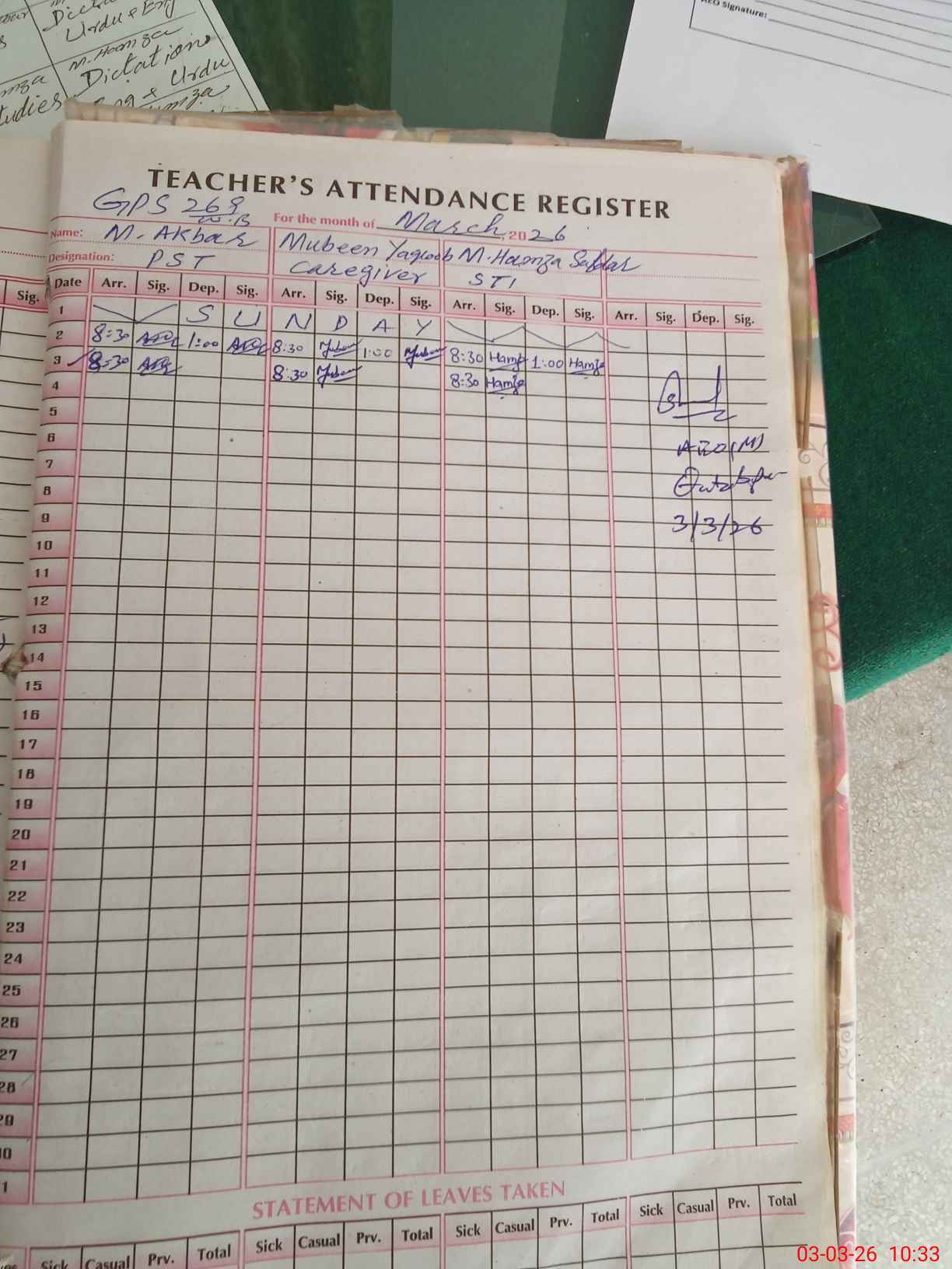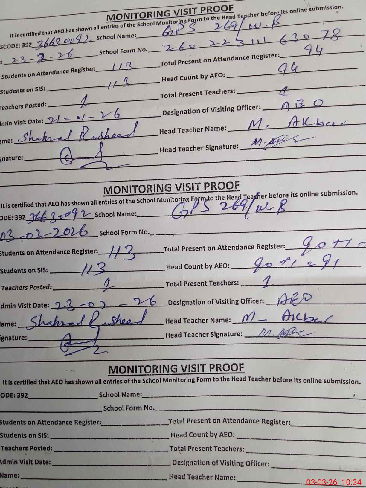 | Monitoring Date: 03-03-2026 | Start Time: 03-03-2026 10:20 AM | End Time: 03-03-2026 10:34 AM | Name of MEA: Sh**** Ra**** | |