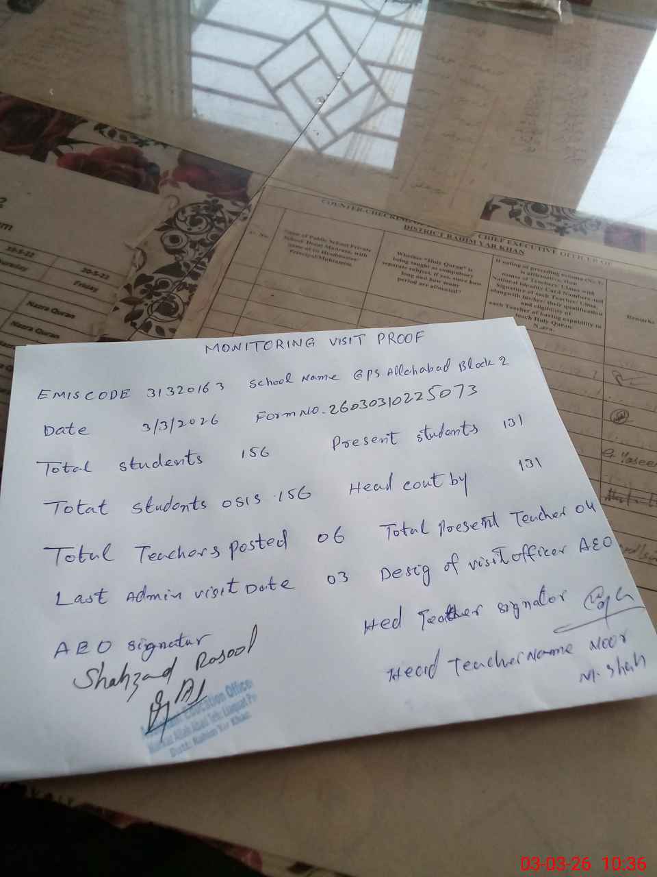| Attendance Register | Head Teacher | MEA with School | Visit Proof |