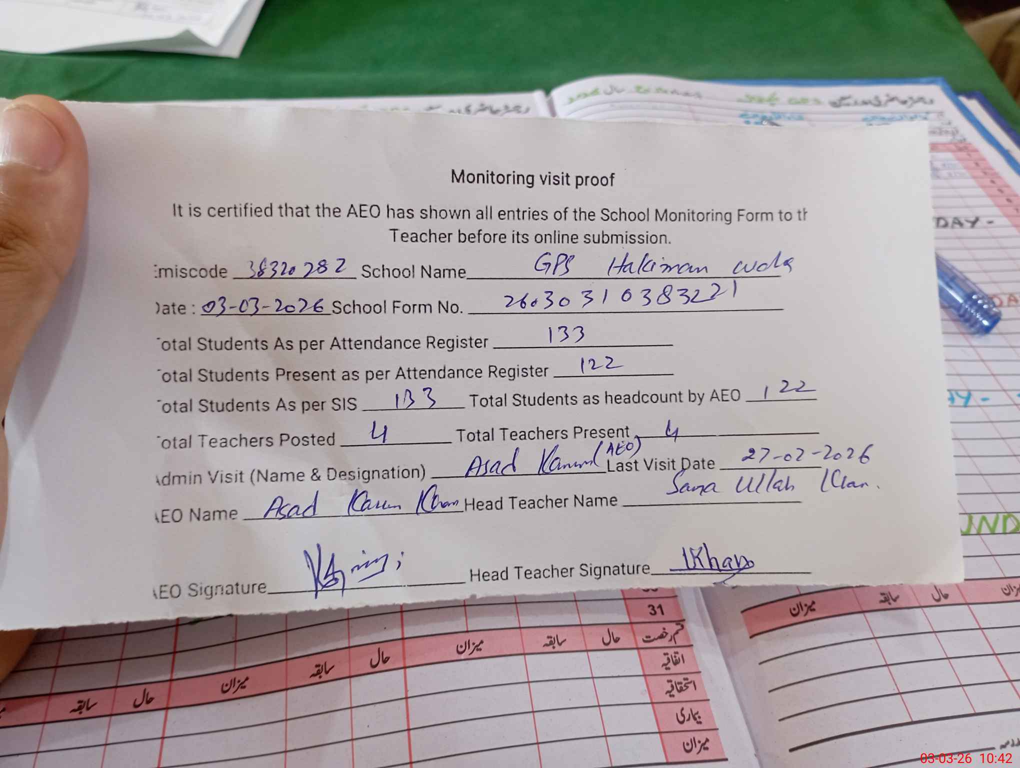 | Attendance Register | Head Teacher | MEA with School | Visit Proof |