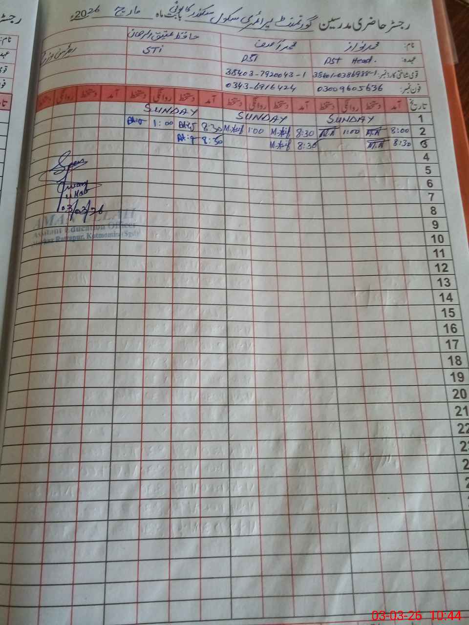 | Name: MU**** NA**** Designation: (School Headmaster's/Headmistress's) PST Phone/Cell Number: 03**** |