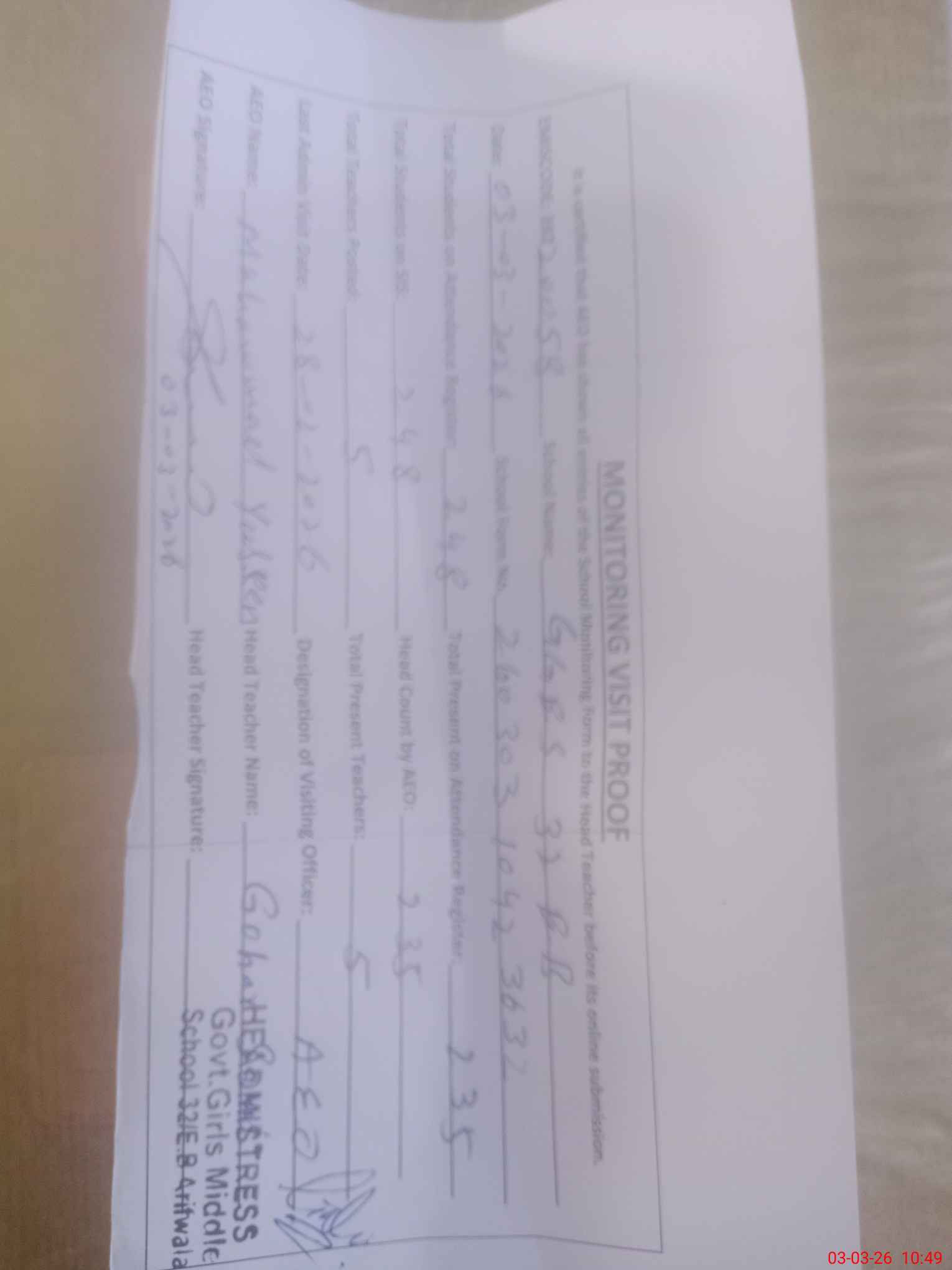 | Certified that this School was Inspected by the Undersigned MEA/DMO Today and the Information Stated Above is as Per Record. | |||||
