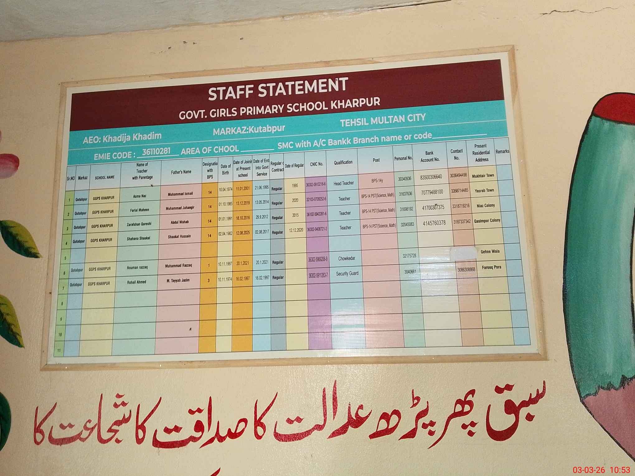 | EMIS Code: 36110281 | Name of School: GGPS KHAR PUR SUI GAS ROAD NEAR CHOWK SHAHBAZ | |||