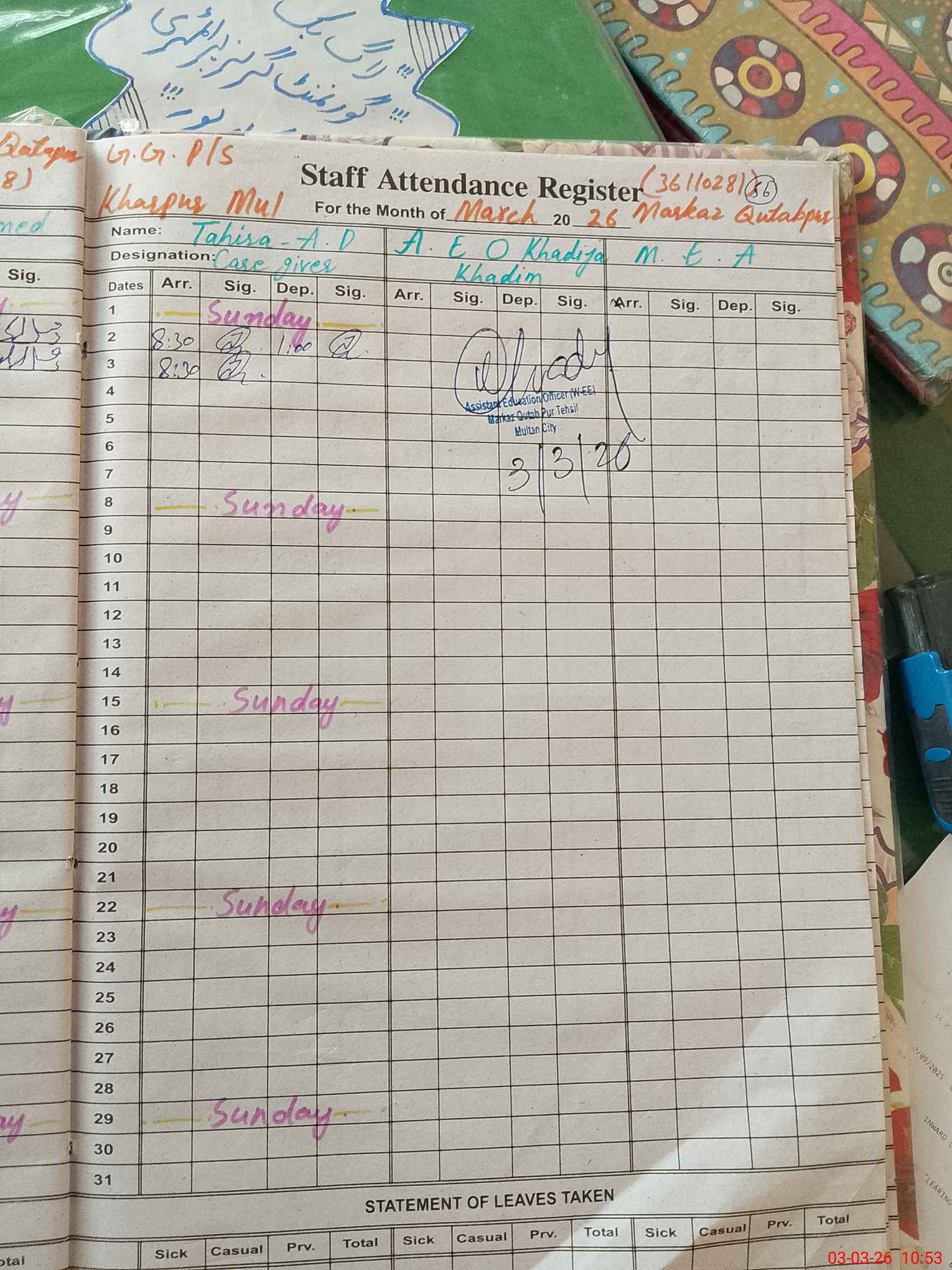 | Monitoring Date: 03-03-2026 | Start Time: 03-03-2026 10:34 AM | End Time: 03-03-2026 10:53 AM | Name of MEA: Kh**** Kh**** | |