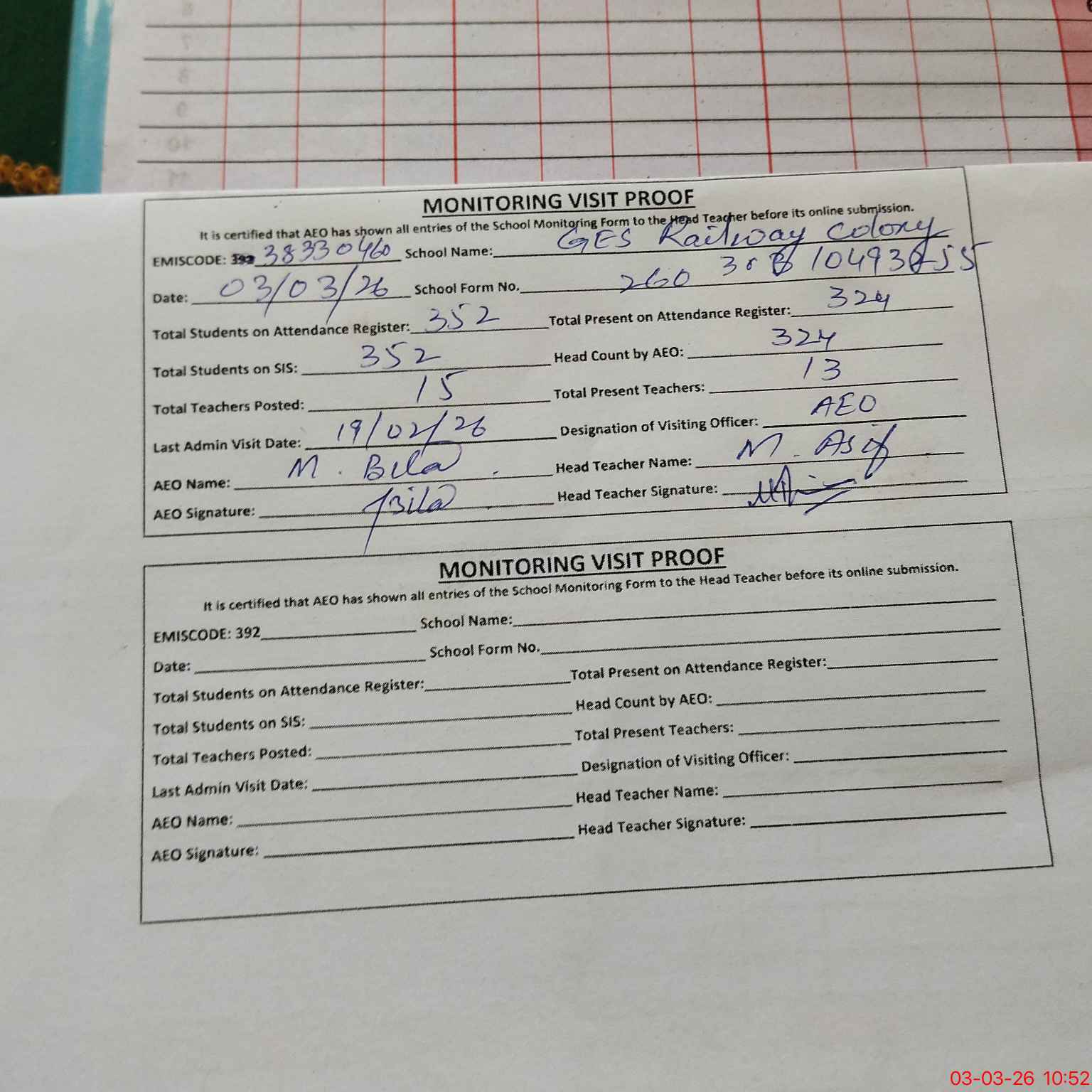 | Monitoring Date: 03-03-2026 | Start Time: 03-03-2026 10:22 AM | End Time: 03-03-2026 11:00 AM | Name of MEA: Mu**** Bi**** | |