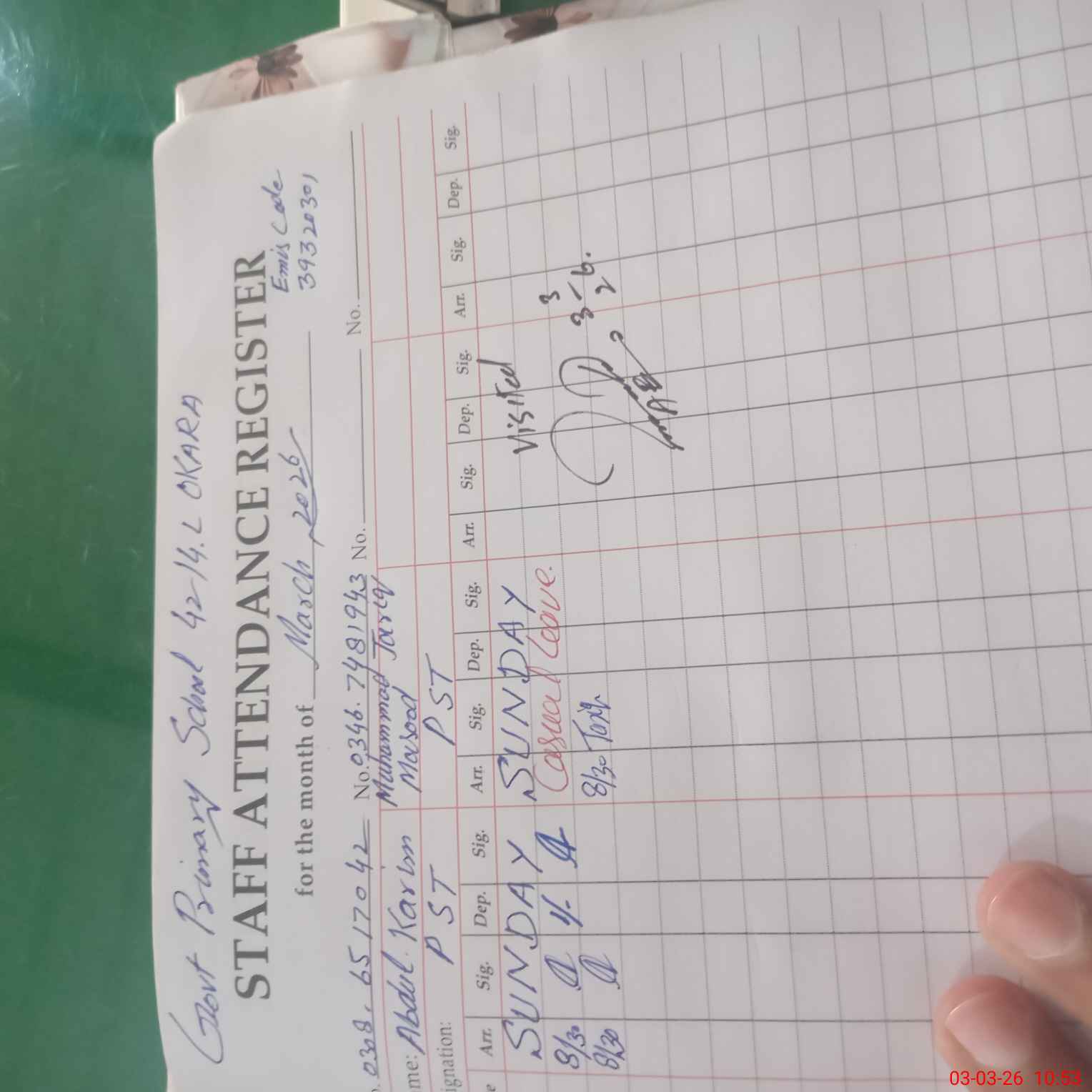 | Name: SA**** URRE**** Designation: (School Headmaster's/Headmistress's) PTC Phone/Cell Number: 03**** |