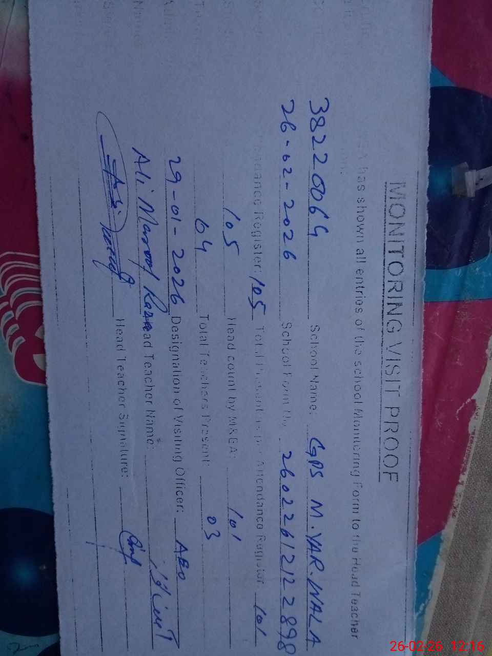 | EMIS Code: 38220064 | Name of School: GPS MUHAMMAD YAR WALA | |||