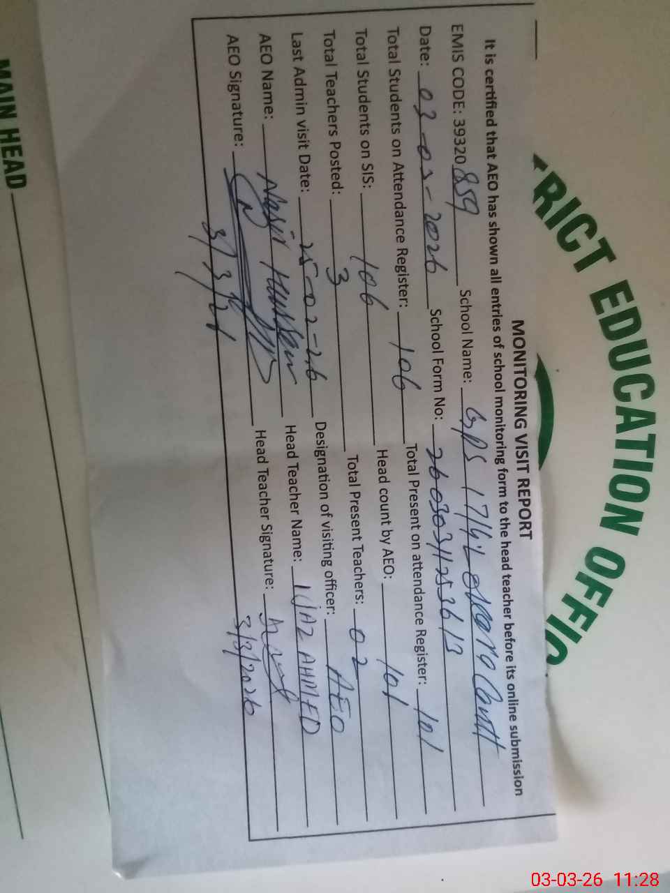 | Name: Ij**** Ah**** Designation: (School Headmaster's/Headmistress's) PST Phone/Cell Number: 03**** |