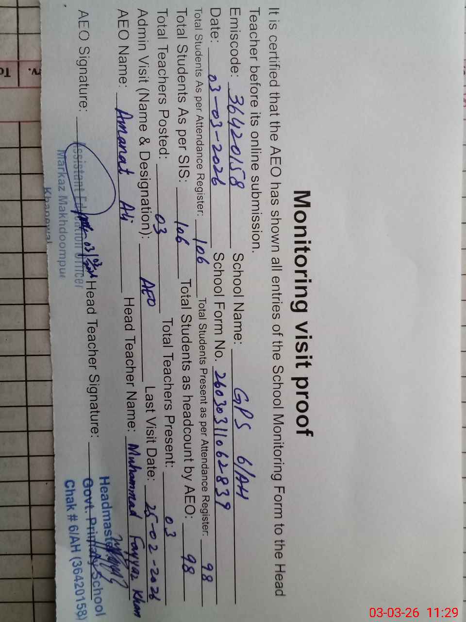 | EMIS Code: 36420158 | Name of School: GPS 6/AH, KHANEWAL | |||