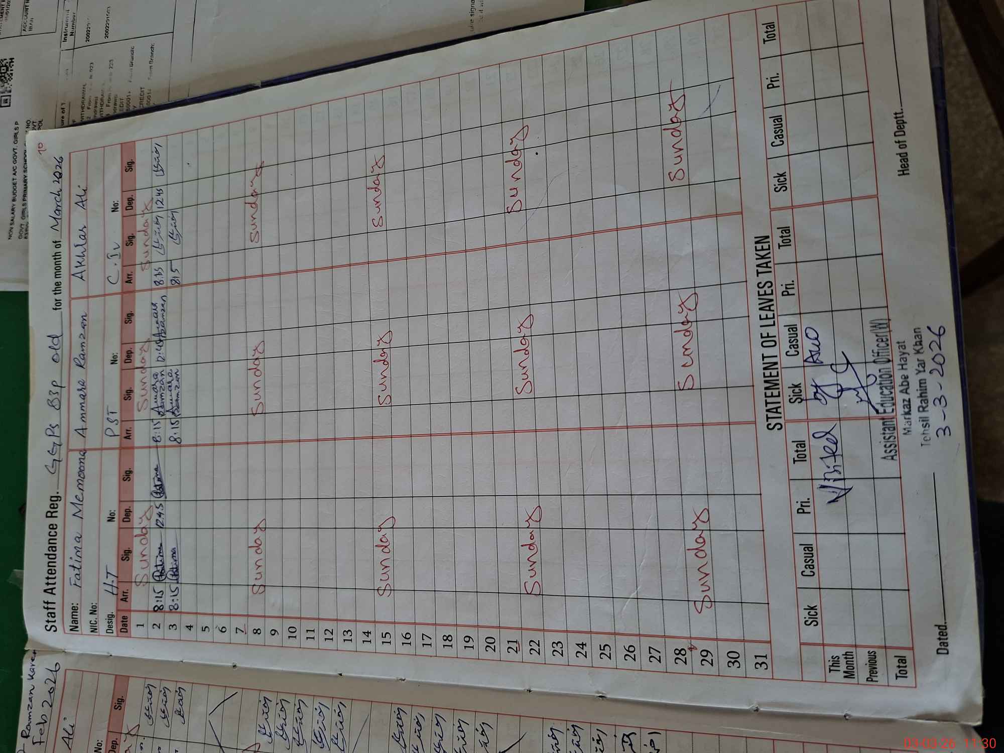 | CNIC | Full Name | Designation | R/C | Absence During Last Calender Month |