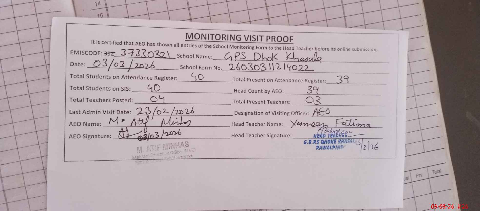 | EMIS Code: 37330321 | Name of School: GPS DHOK KHASALA | |||