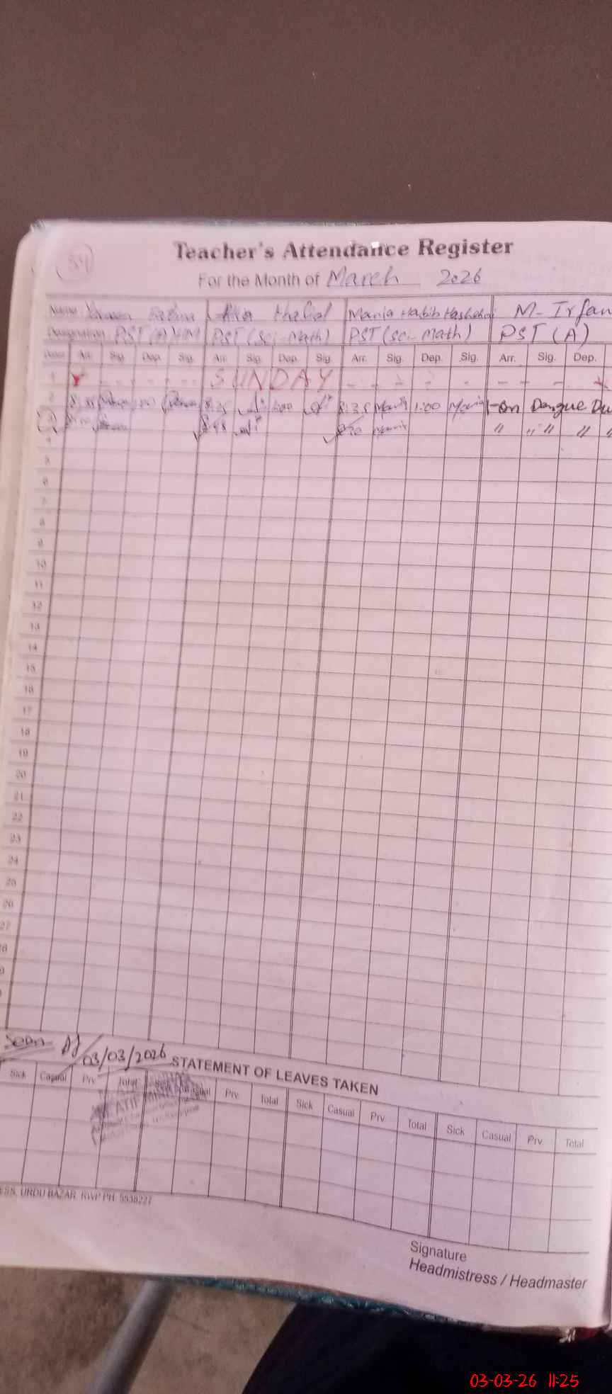 | Leave | Duty | Absent | Maternity | Medical | Ex- Pak |