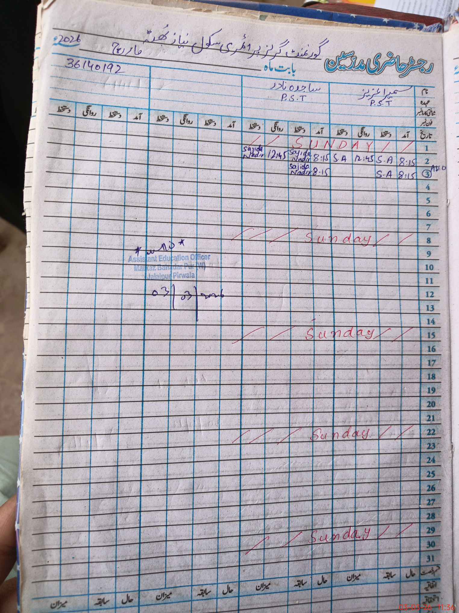 | Name: Su**** Az**** Designation: (School Headmaster's/Headmistress's) PST Phone/Cell Number: 03**** |