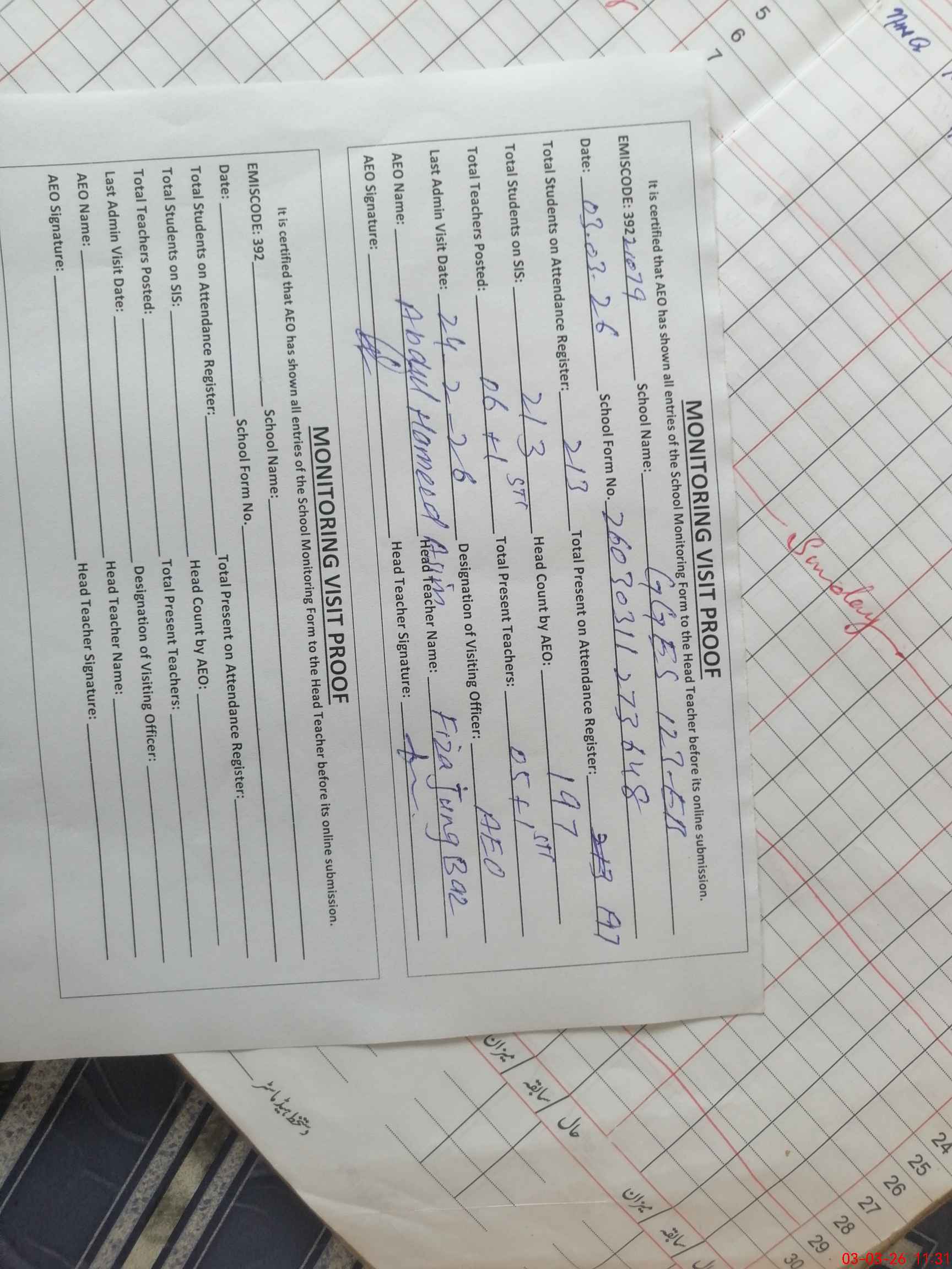 | Attendance Register | Head Teacher | MEA with School | Visit Proof |