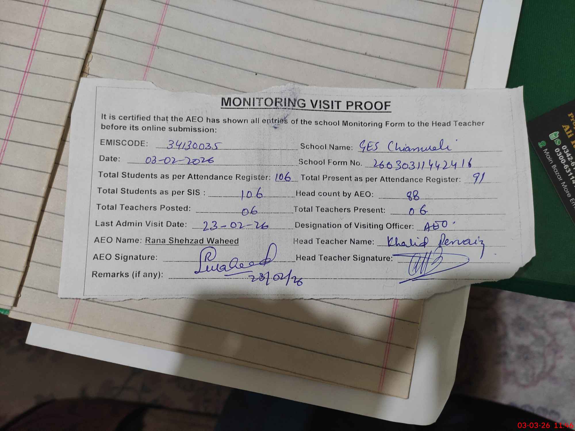 | Attendance Register | Head Teacher | MEA with School | Visit Proof |