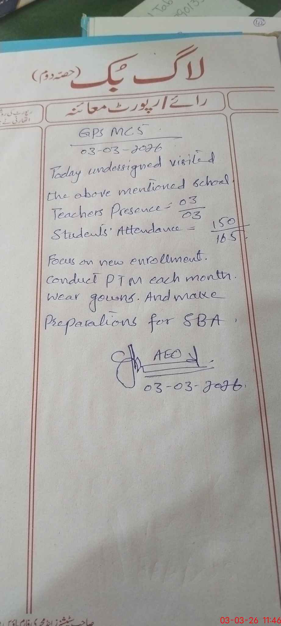 | Attendance Register | Head Teacher | MEA with School | Visit Proof |
