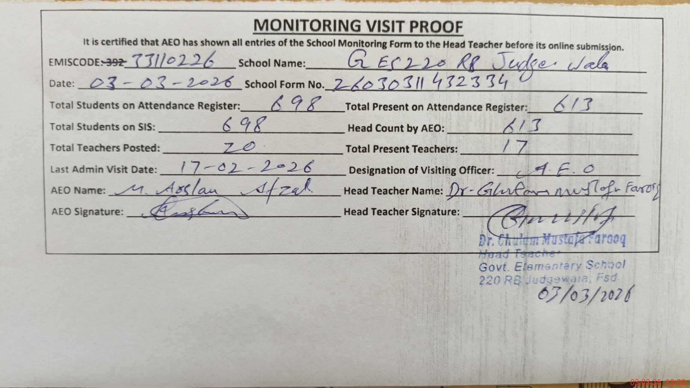 | EMIS Code: 33110226 | Name of School: GES CHAK 220 RB JUDGE WALA FSD | |||