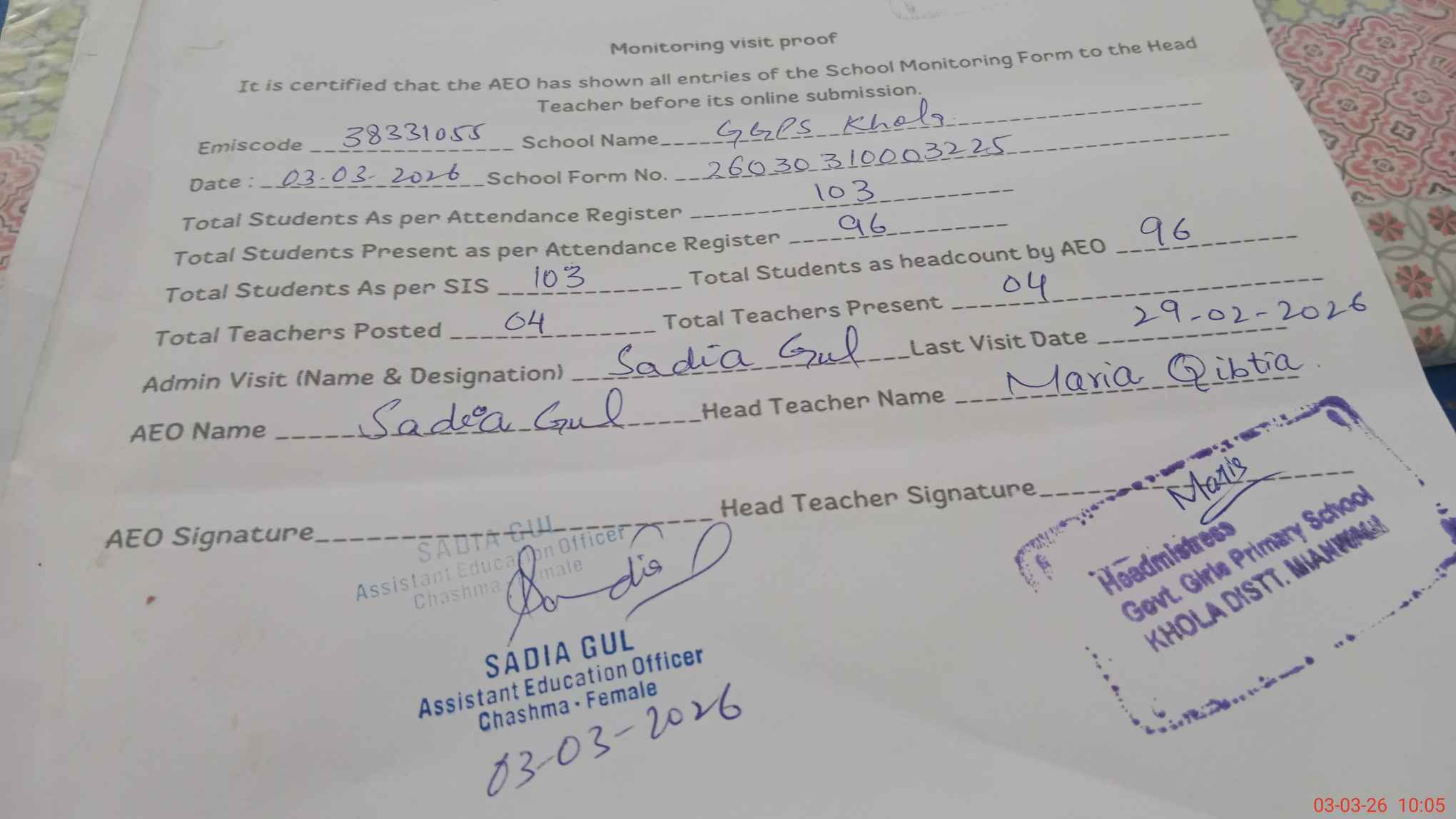 | Remarks (Use Separate Page if Required): school monitoring is done | |||||