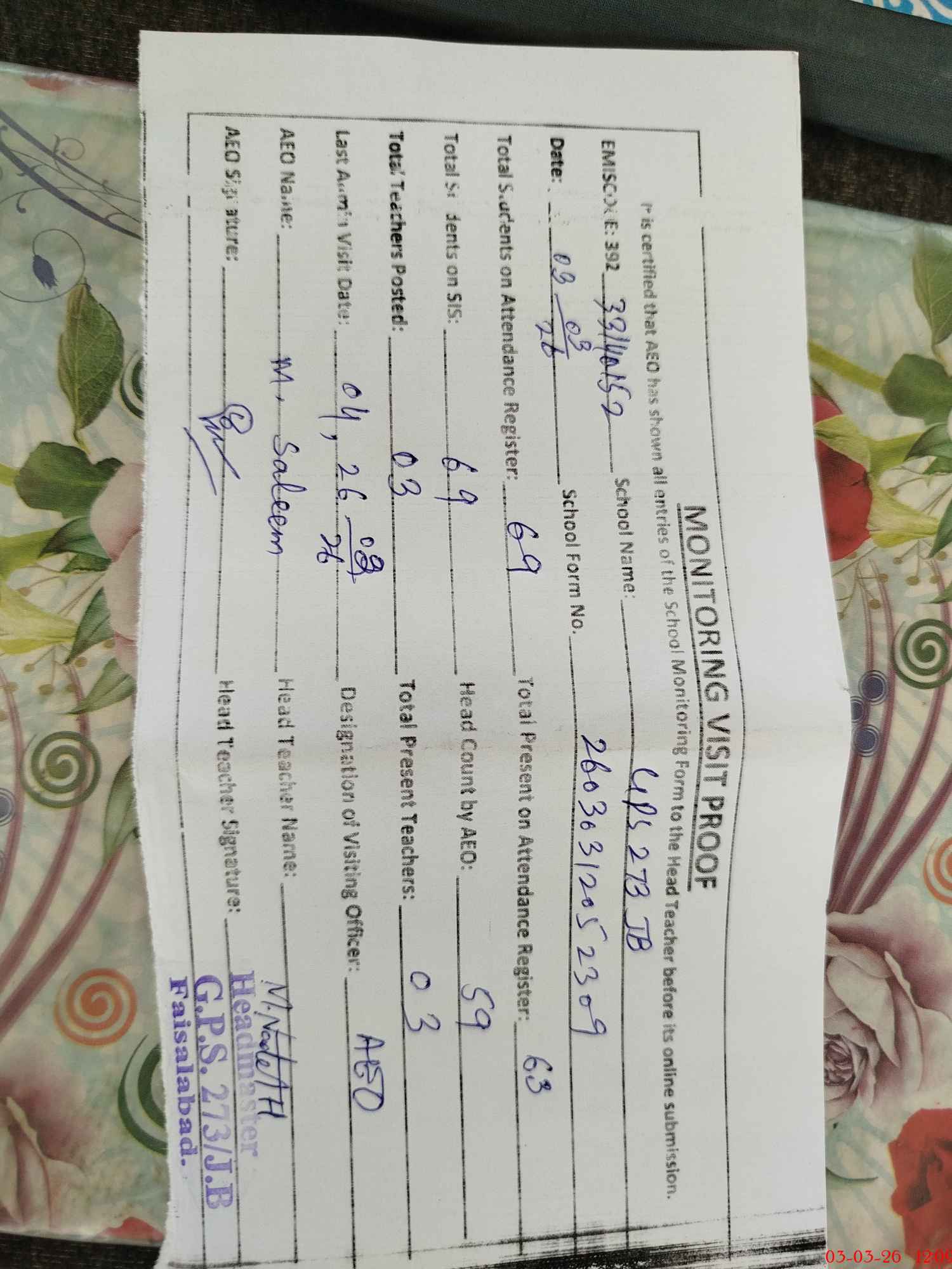 | EMIS Code: 33140152 | Name of School: GPS CHAK 273 JB | |||